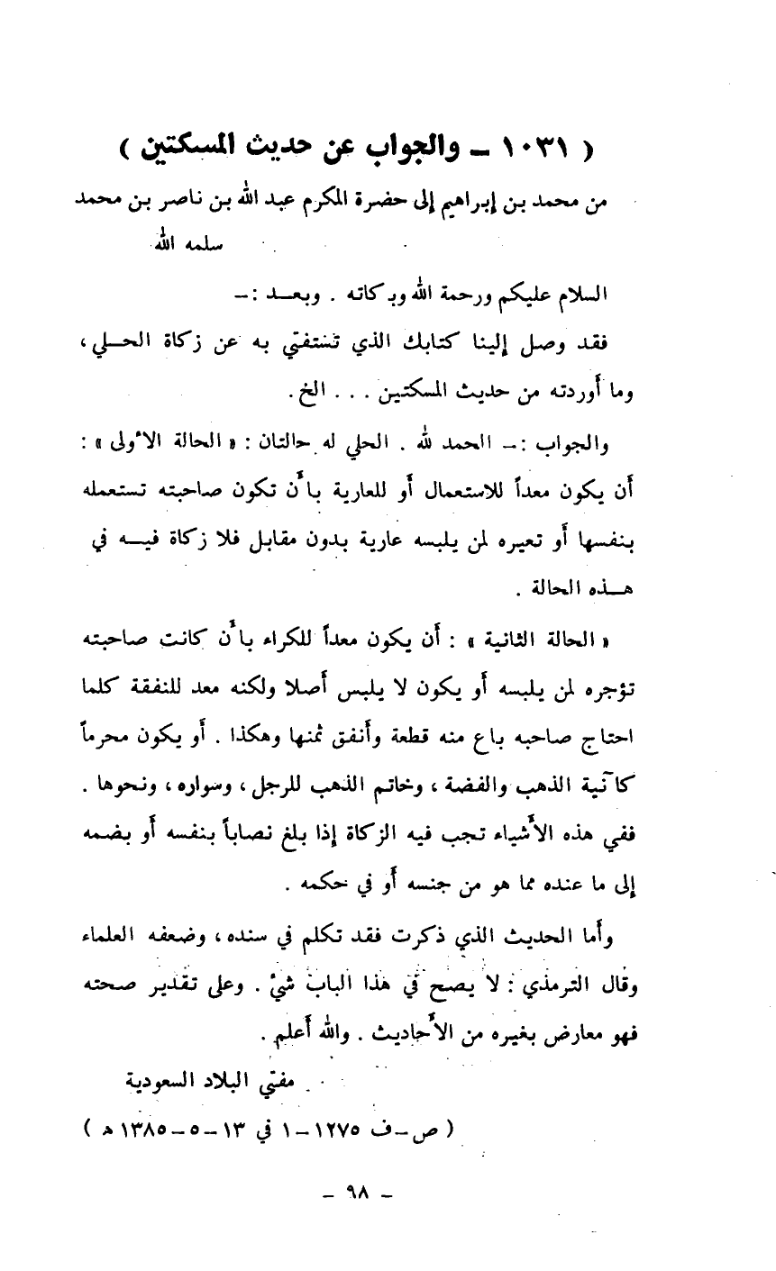 فقد وصل إلينا كتابك الذي تستفتي به عن زكاة الحلي، وما أوردته من حديث المسكتين ... الخ