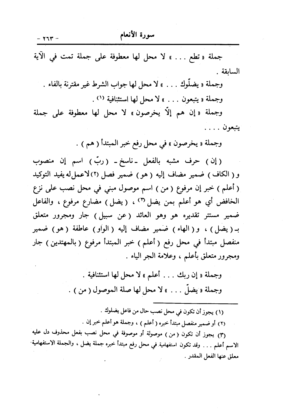 (الواو) عاطفة- أو استئنافيّة- (كنتم) مثل الأول (على شفا) جارّ ومجرور متعلّق بمحذوف خبر كنتم، وعلامة الجرّ الكسرة المقدّرة على الألف (حفرة) مضاف اليه مجرور (من النار) جارّ ومجرور متعلّق بمحذوف نعت لحفرة (الفاء) عاطفة (أنقذ) مثل ألّف و (كم) ضمير مفعول به (من) حرف جرّ و (ها) ضمير في محلّ جرّ متعلّق ب (أنقذ) ، (الكاف) حرف جرّ «1» ، (ذا) اسم إشارة مبنيّ في محلّ جرّ متعلّق بمفعول مطلق محذوف أي: يبيّن الله لكم آياته بيانا كذلك، و (اللام) للبعد و (الكاف) للخطاب، يبيّن مضارع مرفوع (الله) لفظ الجلالة فاعل مرفوع (لكم) مثل عليكم متعلّق ب (يبيّن) ، (آيات) مفعول به منصوب وعلامة النصب الكسرة و (الهاء) ضمير مضاف إليه (لعلّ) حرف مشبّه بالفعل للترجّي و (كم) ضمير في محلّ نصب اسم لعلّ (تهتدون) مضارع مرفوع ... والواو فاعل.