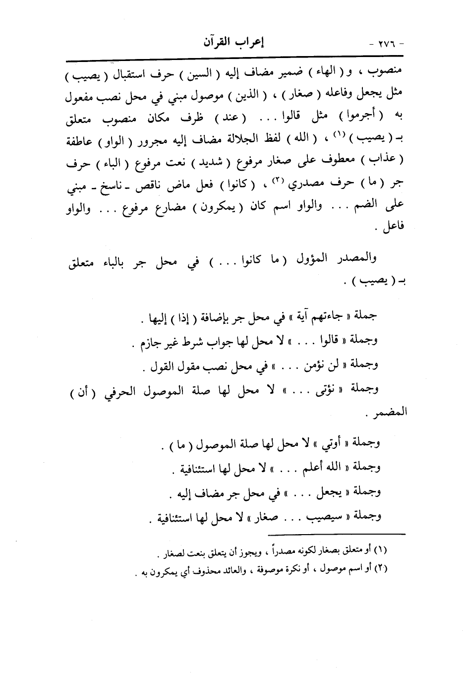 ضرر أذى، وعلامة النصب الفتحة المقدّرة على الألف (الواو) عاطفة (ان) حرف شرط جازم (يقاتلوا) مضارع مجزوم وعلامة الجزم حذف النون ... والواو فاعل و (كم) ضمير مفعول به (يولّوكم) مثل يقاتلوكم، جواب الشرط (الأدبار) مفعول به ثان منصوب (ثمّ) حرف استئناف «1» ، (لا) نافية (ينصرون) مضارع مرفوع مبنيّ للمجهول ... والواو نائب فاعل.