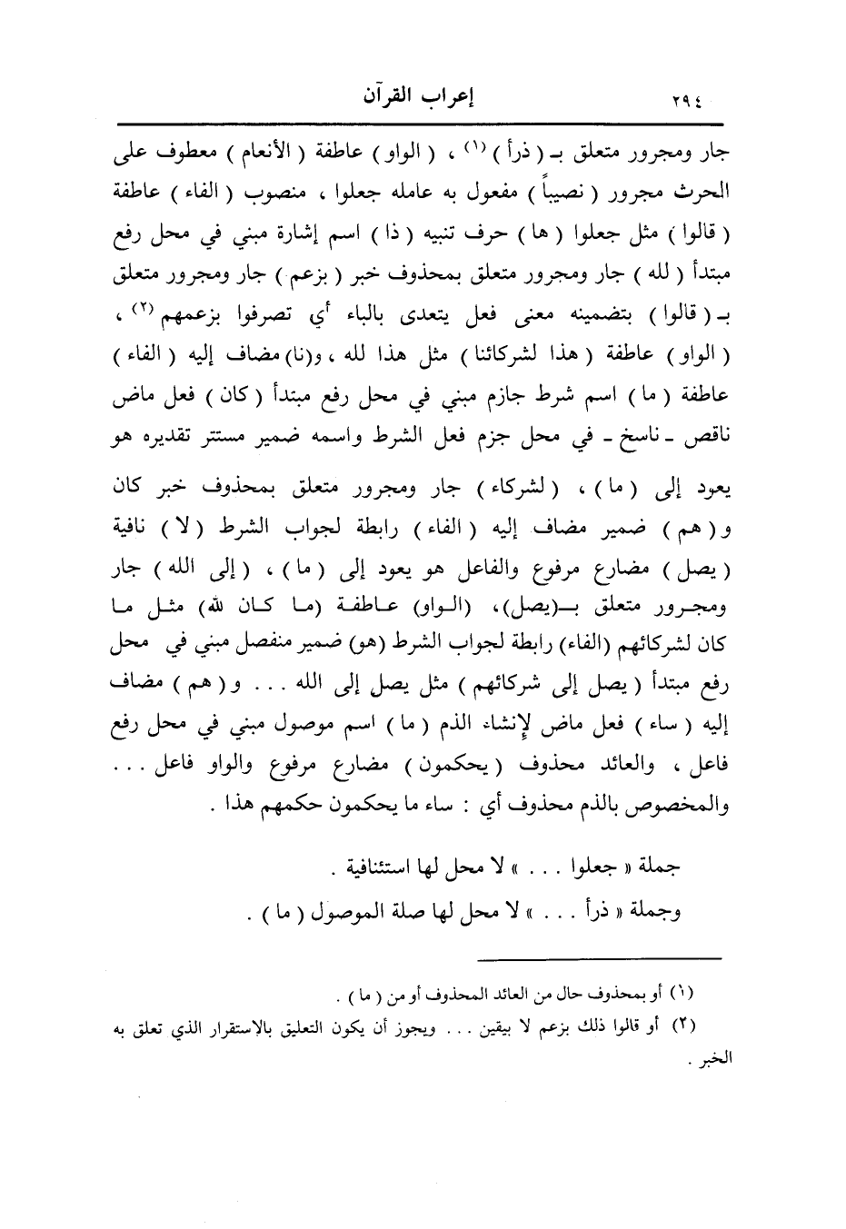 (3) الذي سوّغ جعل الجملة في محلّ جزم لا في محلّ رفع خبرا لمبتدأ محذوف كما هو المألوف- أنّ الجملة مسبوقة بحرف النفي (لا) ، وهذا يقارب سبق الفعل ب (لن) أو (ما) النافيتين حين اقتران الجملة بالفاء.
