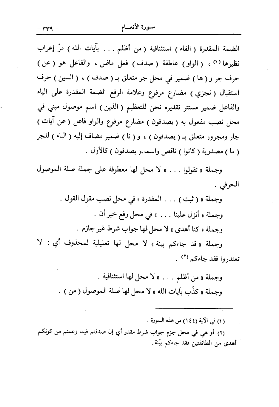 (إذ) ظرف للزمن الماضي مبنيّ في محلّ نصب متعلّق ب (عفا) «1» ، (تصعدون) مضارع مرفوع ... والواو فاعل (الواو) عاطفة (لا) نافية (تلوون) مثل تصعدون (على أحد) جارّ ومجرور متعلّق ب (تلوون) (الواو) حاليّة (الرسول) مبتدأ مرفوع (يدعو) مضارع مرفوع وعلامة الرفع الضمّة المقدّرة و (كم) ضمير مفعول به والفاعل ضمير مستتر تقديره هو (في أخرى) جارّ ومجرور متعلّق بمحذوف حال من فاعل يدعو، وعلامة الجرّ الكسرة المقدّرة على الألف و (كم) ضمير مضاف إليه (الفاء) عاطفة لربط السبب بالمسبّب (أثاب) فعل ماض و (كم) ضمير مفعول به، والفاعل ضمير مستتر تقديره هو أي الله (غمّا) مفعول به ثان منصوب (بغمّ) جارّ ومجرور متعلّق بمحذوف نعت ل (غمّا) أي غمّا ملتبسا بغمّ (اللام) تعليليّة جارّة (كي) حرف مصدريّ ونصب (لا) «2» نافية (تحزنوا) مضارع منصوب وعلامة النصب حذف النون.. والواو فاعل (على) حرف جرّ (ما) اسم موصول مبنيّ في محلّ جرّ متعلّق ب (تحزنوا) ، (فات) فعل ماض و (كم) ضمير مفعول به، والفاعل ضمير مستتر تقديره هو، وهو العائد.