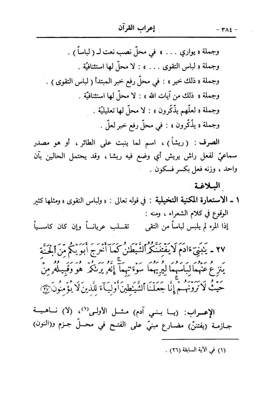 1- «أَنَّما نُمْلِي لَهُمْ خَيْرٌ لِأَنْفُسِهِمْ» مستعار من أملى لفرسه إذا أرخى له الطول ليرعى كيف يشاء فقد شبه إمهالهم وترك الحبل لهم على غواربهم بالفرس الذي يملى له الحبل ليجري على سجيته فحذف المشبّه وهو الإمهال والترك وأبقى المشبّه به وهو الإملاء. وهذا من قبيل الاستعارة التصريحية.