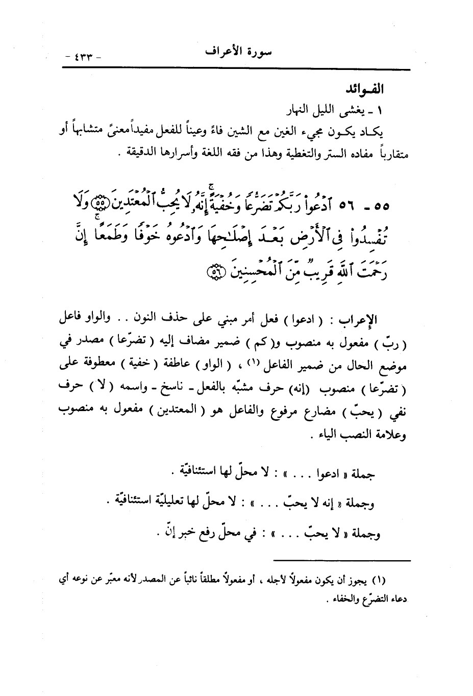 فأهل البيان يقولون: المنهي متى كان درجات، فطريق البلاغة النهي عن أدناها، تنبيها على الأعلى، كقوله تعالى: «فَلا تَقُلْ لَهُما أُفٍّ» وإذا اعتبرت هذا القانون بهذه الآية وجدته ببادئ الرأى مخالفا لها، إذ أعلى درجات أكل مال اليتيم في النهي أن يأكله وهو غني عنه، وأدناها أن يأكله وهو فقير إليه، فكان مقتضى القانون المذكور أن ينهى عن أكل مال اليتيم من هو فقير إليه، حتى يلزم نهي الغني عنه من طريق الأولى. ولا شك أن النهي عن الأدنى وإن أفاد النهي عن الأعلى إلا أن للنهي عن الأعلى أيضا فائدة أخرى جليلة لا تؤخذ من النهي عن الأدنى، وذلك أن المنهي كلما كان أقبح كانت النفس عنه أنفر، والداعية إليه أبعد، ولا شك أن المستقر في النفوس أن أكل مال اليتيم مع الغنى عنه أقبح الصور الأكل، فخصص بالنهي تشنيعا على من يقع فيه.