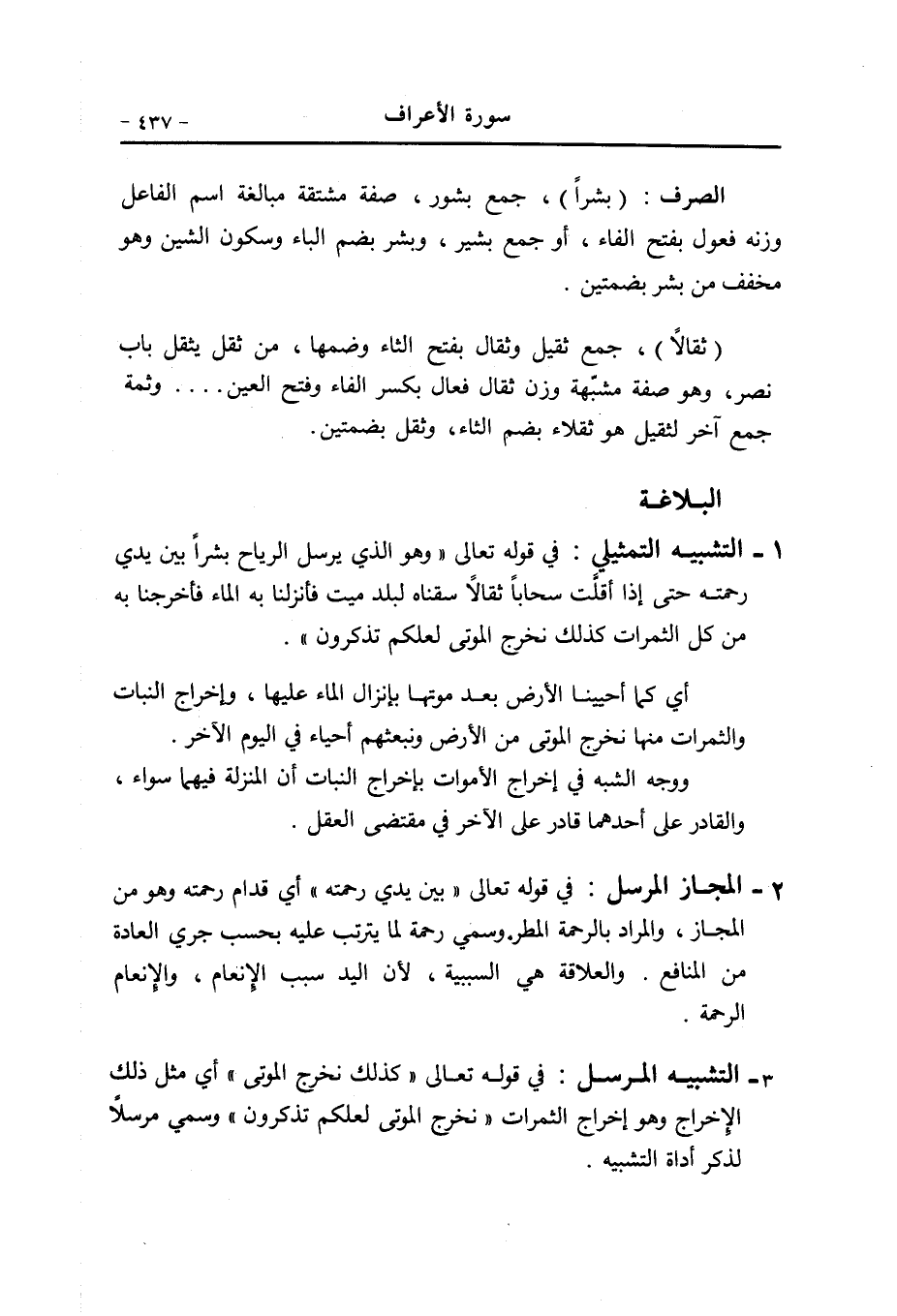 (الواو) عاطفة (آتوا) مثل انكحوا في الآية السابقة (النساء) مفعول به منصوب (صدقات) مفعول به ثان منصوب وعلامة النصب الكسرة و (هنّ) ضمير متّصل في محلّ جرّ مضاف إليه (نحلة) حال منصوبة من ضمير الفاعل أى ناحلين، أو من النساء أي منحولات «1» . (الفاء) استئنافيّة (إن) حرف شرط جازم (طبن) فعل ماض مبنيّ على السكون في محلّ جزم فعل الشرط.. و (النون) ضمير فاعل (اللام) حرف جرّ و (كم) ضمير في محلّ جرّ متعلّق ب (طبن) بتضمينه معنى تنازلن (عن شيء) جارّ ومجرور متعلّق ب (طبن) (من) حرف جرّ و (الهاء) ضمير في محلّ جرّ متعلّق بمحذوف نعت لشيء (نفسا) تمييز منصوب محوّل عن فاعل (الفاء) رابطة لجواب الشرط (كلوا) مثل انكحوا في الآية السابقة و (الهاء) ضمير مفعول به (هنيئا) مصدر في موضع الحال «2» إمّا من الواو أي هانئين أو من الهاء أي مهنّأ (مريئا) مصدر في موضع الحال كذلك.