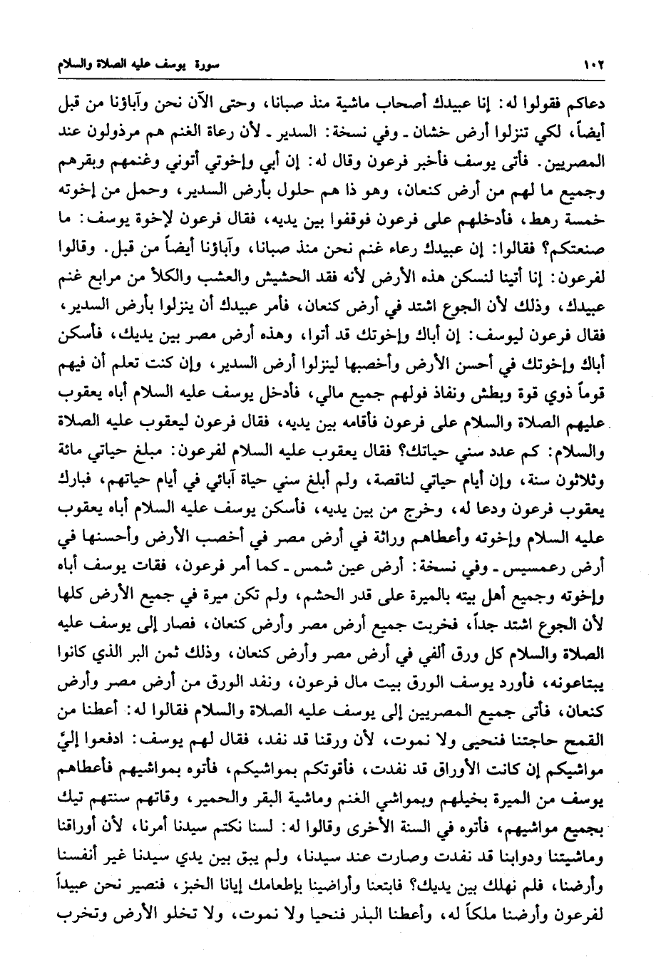 وقالوا لفرعون : إنا أتينا لنسكن هذه الأرض لأنه فقد الحشيش والعشب والكلأ من مرابع غنم عبيدك ، وذلك لأن الجوع اشتد في أرض كنعان ، فأمر عبيدك أن ينزلوا بأرض السدير ، فقال فرعون ليوسف : إن أباك وإخوتك قد أتوا ، وهذه أرض مصر بين يديك ، فأسكن أباك وإخوتك في أحسن الأرض وأخصبها لينزلوا أرض السدير ، وإن كنت تعلم أن فيهم قوماً ذوي قوة وبطش ونفاذ فولهم جميع مالي ، فأدخل يوسف عليه السلام أباه يعقوب عليهم الصلاة والسلام على فرعون فأقامه بين يديه ، فقال فرعون ليعقوب عليه الصلاة والسلام : كم عدد سني حياتك ؟ فقال يعقوب عليه السلام لفرعون : مبلغ حياتي مائة وثلاثون سنة ، وإن أيام حياتي الناقصة ، ولم أبلغ سني حياة آبائي في أيام حياتهم ، فبارك يعقوب فرعون ودعا له ، وخرج من بين يديهن فأسكن يوسف عليه السلام أباه يعقوب عليه السلام وإخوته وأعكاهم وراثة في أرض مصر في أخصب الأرض وأحسنها في أرض رعمسيس - وفي نسخة : أرض عين شمش - كما أمر فرعونن فقات يوسف أباه وإخوته وجميع أهل بيته بالميرة على قدر الحشم ، ولم تكن ميرة في جميع الأرض كلها لأن الجوع اشتد جداً ، فخرجت جميع أرض مصر وأرض كنعان ، فصار إلى يوسف عليه الصلاة والسلام كل ورق ألفي في أرض مصر وأرض كنعان ، وذلك ثمن البر الذي كانوا يبتاعونه ، فأورد يوسف الورق بيت مال فرعون ، ونفد الورق من أرض مصر وأرض كنعان ، فأتى جميع المصريين إلى يوسف عليه الصلاة والسلام فقالوا له : أعطنا من القمح حاجتنا فنحيى ونموت ، لأن ورقنا قد نفذ ، فقال لهم يوسف : ادفعوا إليَّ مواشيكم إن كانت الأوراق قد نفدت ، فأقوتكم بمواشيكم ، فأتوه بمواشيهم فأعطاهم يوسف من الميرة بخيلهم ومواشي الغنم وماشية البقر والحمير ، وقاتهم سنتهم تيك بجميع مواشيهم ، فأتوه في السنة الأخرى وقالوا له : لسنا نكتم سيدنا أمرنا ، لأنن أوراقنا وماشيتنا ودوابنا قد نفدت وصارت عند سيدنا ، ولم يبق بين يدي سيدنا غير أنفسنا وأرضنا ، فلم نهلك بين يديك ؟ فابتعنا وأراضينا بإطعامك إيانا الخبز ، فنصير نحن عبيداً لفرعون وأرضنا ملكاً له ، وأعطنا البذر فنحيا ولا نموت ، ولا تخلو الأرض وتخرب