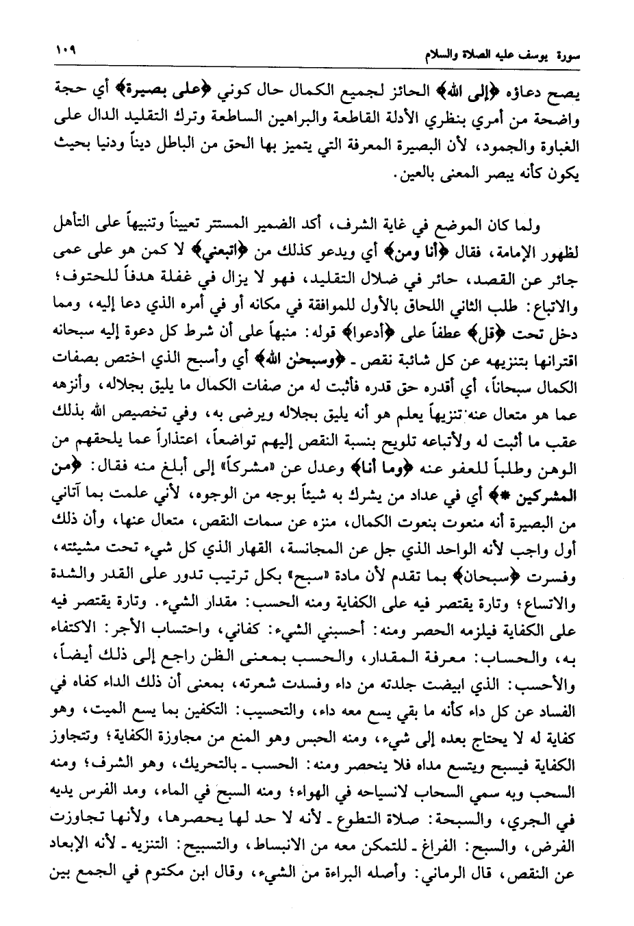 ولما كان الموضع في غاية الشرف ، أكد الضمير المستتر تعييناً وتنبيهاً على التأهل لظهور الإمامة ، فقال : ( أنا ومن ) أي يدعو كذلك من ) اتبعني ( لا كمن هو على عمى جائر عن القصد ، حائر في ضلال التقليد ، فهو لا يزال في غفلة هدفاً للحتوف ؛ والاتباع : طلب الثاني اللحاق بالأول للموافقة في مكانه أو في أمره الذي دعا إليه ، ومما دخل تحت ) قل ( عطفاً على ) أدعوا ( قوله : منبهاً على أن شرط كل دعوة إليه سبحانه اقترانها بتنزيهه عن كل شائبة نقص - ) وسبحان الله ) أي وأسبح الذي اختص بصفات الكمال سبحاناً ، أي أقدره حق قدره فأثبت له من صفات الكمال ما يليق بجلاله ، وأنزهه عما هو متعال عنه تنزيهاً يعلم هم أنه يليق بجلالة ويرضى به ، وفي تخصيص الله بذلك عقب ما أثبت له ولأتباعه تلويح بنسبة النقص إليهم تواضعاً ، اعتذاراً عما يلحقهم من الوهن وطلباً للعفو عنه ) وما أنا ( وعدل عن ( مشركاً ) إلى أبلغ منه فقال : ( من المشركين ) أي في عداد من يشرك به شيئاً بوجه من الوجوه ، لأني علمت بما آتاني من البصيرة أنه منعوت بنعوت الكمال ، منزه عن سمات النقص ، متعال عنها ، وأن ذلك أول واجب لأنه الواحد الذي جل عن المجانسة ، القهار الذي كل شيء تحت مشيئته ، وفسرت ) سبحان ( بما تقدم لأن مادة ( سبح ) بكل ترتيب تدور على القدر والشدة والاتساع ؛ وتارة يقتصر فيه على الكفاية ومنه الحسب : مقدار الشيء .