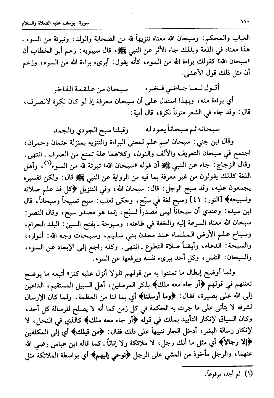 بين العباب والمحكم : سبحان الله معناه تنزيهاً لله من الصحابة والولد ، وتبرئة من السوء - هذا معناه في اللغة وبذلك جاء الأثر عن النبي ( صلى الله عليه وسلم ) ، قال سيبويه : زعم أبو الخطاب أن ( سبحان الله ) كقولك براءة الله من السوء ، كأنه يقول : أبرىء براءة الله من السوء ، وزعم أن مثل ذلك قول الأعشى :