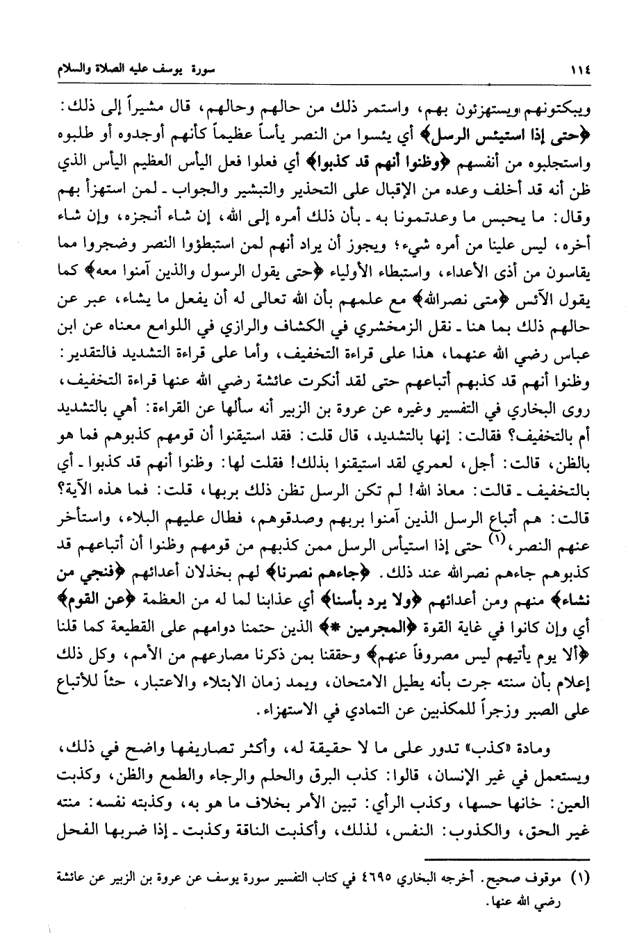 ويبتكونهم ويستهزئون بهم ، واستمر ذلك من حالهم وحالهم ، قال مشيراً إلى ذلك : ( حتى إذا استيئس الرسل ) أي يئسوا من النصر يأساً عظيماً كأنهم أوجدوه أو طلبوه واستجلبوه من أنفسهم ) وظنوا أنهم قد كذبوا ) أي فعلوا فعل اليأس العظيم اليأس الذي ظن أنه قد أخلف وعده من الإقبال على التحذير والتبشير والجواب - لمن استهزأ بهم وقال : ما يحبس ما وعدتمونا به - بإن ذلك أمره إلى الله ، إن شاء أنجزه ، وإن شاء أخره ، ليس علينا من أمره شيء ؛ ويجوز أن يراد أنهم لمن استبطؤوا النصر وضجروا مما يقاسون من أذى الأعداء ، واستبطاء الأولياء ) حتى يقول الرسول والذين آمنوا معه ( كما يقول الآئس ) متى نصر الله ( مع علمهم بأن الله تعالى له أن يفعل ما يشاء ، عبر عن حالهم ذلك بما هنا - نقل الزمخشري في الكشاف والرازي في اللوامع معناه عن ابن عباس رضي الله عنهما ، هذا على قراءة التخفيف ، وأما على قراءة التشديد فالتقدير : وظنوا أنهم قد كذبهم أتباعهم حتى لقد أنكرت عائشة رضي الله عنها قراءة التخفيف ، روى البخاري في التفسير وغيره عن عروة بن الزبير أنه سألها عن القراءة : أهي بالتشديد أم التخفف ؟ فقالت : إنها بالتشديد ، قال قلت : فقد استيقنوا أن قومهم كذبوهم فما هو بالظن ، قالت : أجل ، لعمري لقد استيقنوا بذلك فقلت لها : وظنوا أنهم قد كذبوا فما هو بالتخفيف - قالت : معاذ الله لم تكت الرسل تظن ذلك بربها ، قلت : فما هذه الآية ؟ قالت : هم أتباع الرسل الذين آمنوا بربهم وصدقوهم ، فطال عليهم البلاء ، واستأخر عنهم النصر ، حتى إذا استيأس الرسل ممن كذبهم من قومهم وظنوا أنهم أتباعهم قد كذبوهم جاءهم نصرالله عند ذلك .