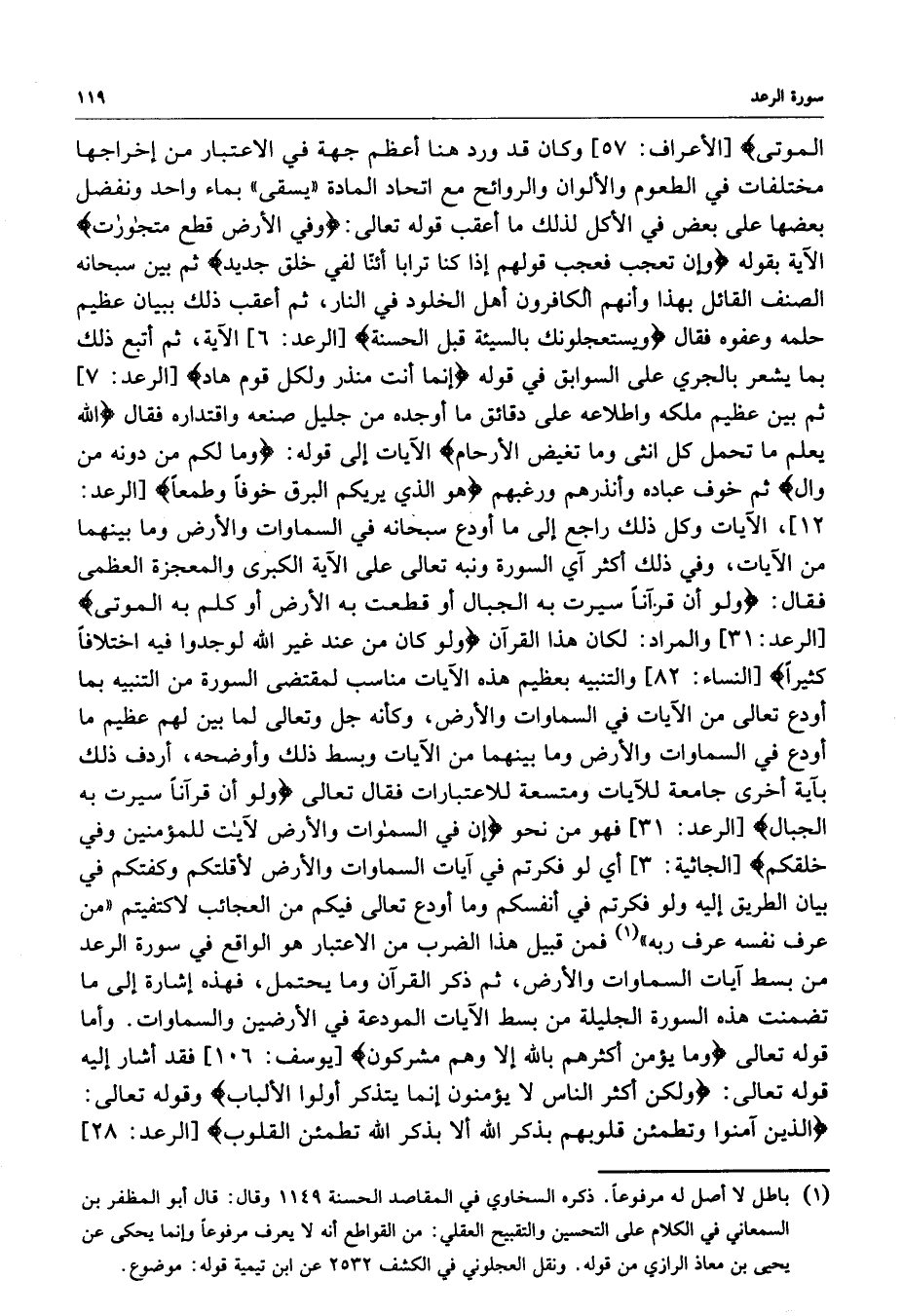 [ الجاثية : 3 ] أي لو فكرتم في آيات السماوات والأرض لأقلتكم وكفتكم في بيان الطريق إليه ولو فكرتم في أنفسكم وما أودع تعالى فيكم من العجائب لاكتفيتم ( من عرف نفسه عرف ربه ) فمن قبيل هذا الضرب من الاعتبار هو الواقع في سورة الرعد من بسط آيات السماوات والأرض ، ثم ذكر القرآن وما يحتمل ، فهذه إشارة إلى ما تضمنت هذه السورة الجليلة من بسط الآيات المودعة في الأرضين والسماوات .
