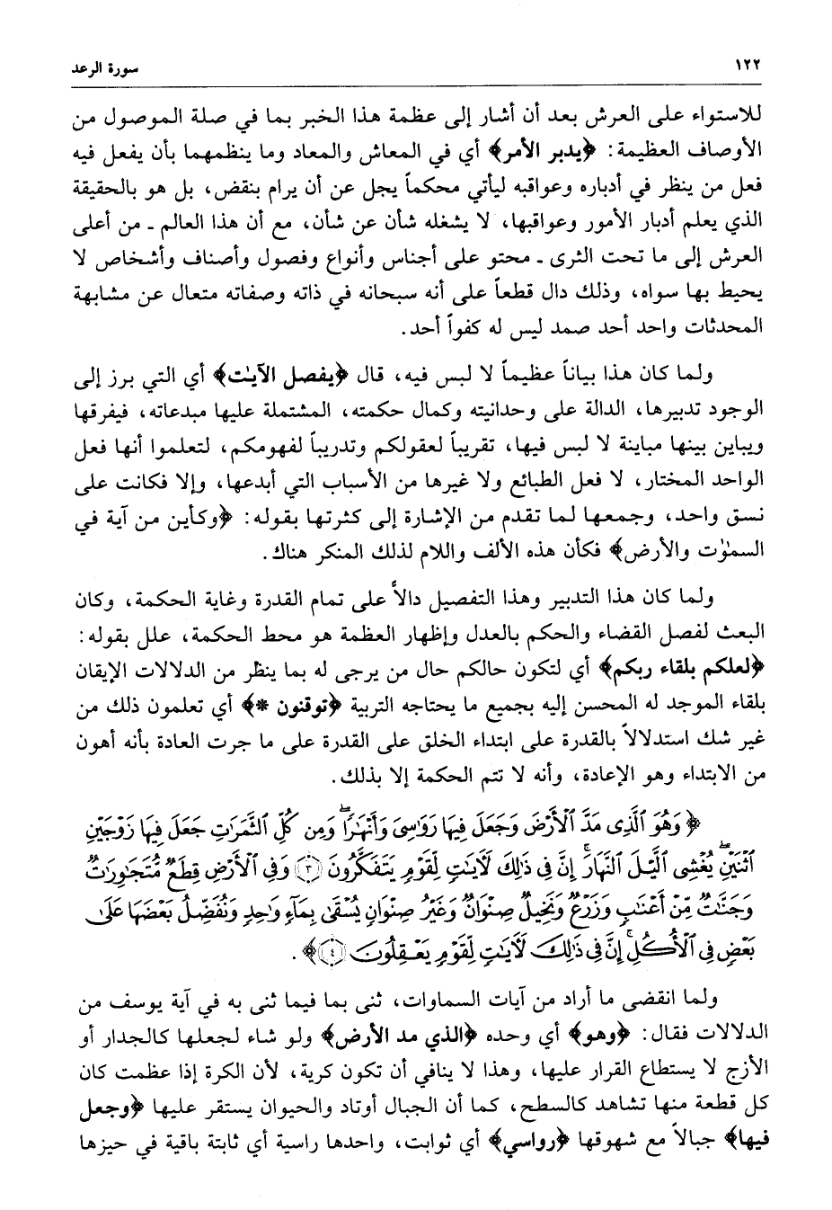 ) وَهُوَ الَّذِي مَدَّ الأَرْضَ وَجَعَلَ فِيهَا رَوَاسِيَ وَأَنْهَاراً وَمِن كُلِّ الثَّمَرَاتِ جَعَلَ فِيهَا زَوْجَيْنِ اثْنَيْنِ يُغْشِي الْلَّيْلَ النَّهَارَ إِنَّ فِي ذلِكَ لآيَاتٍ لِّقَوْمٍ يَتَفَكَّرُونَ وَفِي الأَرْضِ قِطَعٌ مُّتَجَاوِرَاتٌ وَجَنَّاتٌ مِّنْ أَعْنَابٍ وَزَرْعٌ وَنَخِيلٌ صِنْوَانٌ وَغَيْرُ صِنْوَانٍ يُسْقَى بِمَآءٍ وَاحِدٍ وَنُفَضِّلُ بَعْضَهَا عَلَى بَعْضٍ فِي الأُكُلِ إِنَّ فِي ذلِكَ لآيَاتٍ لِّقَوْمٍ يَعْقِلُونَ ( ( )
