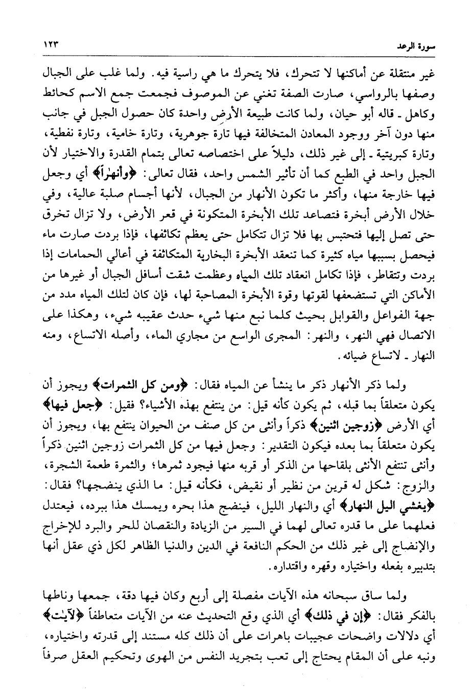 ولما غلب على الجبال وصفها بالرواسي ، صارت الصفة تغني عن الموصوف فجمعت جمع الاسم كحائط وكاهل - قاله أبو حيان ، ولما كانت طبيعة الأرض واحدة كان حصولها الجبل في جانب منها دون آخر ووجود المعادن المتخالفة فيها تارة جوهرية ، وتارة خامية ، وتارة نفطية ، وتارة كبريتية - إلى غير ذلك ، دليلاً على اختصاصه تعالى بتمام القدرة والاختيار لأن الجبل الواحد في الطبع كما أن تأثير الشمس واحد ، فقال تعالى : ( وأنهاراً ) أي وجعل فيها خارجة منها ، وأكثر ما تكون الأنهار من الجبال ، لأنها أجسام صلبة عالية ، وفي خلال الأرض أبخرة فتصاعد تلك الأبخرة المتكونة في قعر الأرض ، ولا تزال تخرق حتى تصل إليها فتحتبس بها فلا تزال تتكامل حتى يعظم تكاثفها ، فإذا بردت صارت ماء فيحصل بسببها مياه كثيرة كما تنعقد الأبخرة البخارية المتكاثفة في أعالي الحمامات إذا بردت وتتقاطر ، فإذا تكامل انعقاد تلك المياه وعظمت شقت أسافل الجبال أو غيرها من الأماكن التي تستضعفها لقوتها وقوة الأبخرة المصاحبة لها ، فإن كان لتلك المياه مدد من جهة الفواعل والقوابل بحيث كلما نبع الواسع من مجاري الماء ، وأصله الاتساع ، ومنه النهار - لاتساع ضيائه .