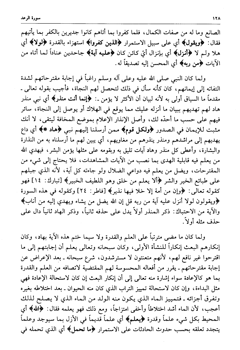 [ فاطر : 24 ] وكقوله في هذه السورة ) ويقولون لولا أنزل عليه آية من ربه قل إن الله يضل من يشاء ويهدي إليه من أناب ( والآية من الاحتباك : ذكر المنذر أولاً يدل على حذفه ثانياً ، وذكر الهاد ثانياً دال على حذف مثله أولاً .