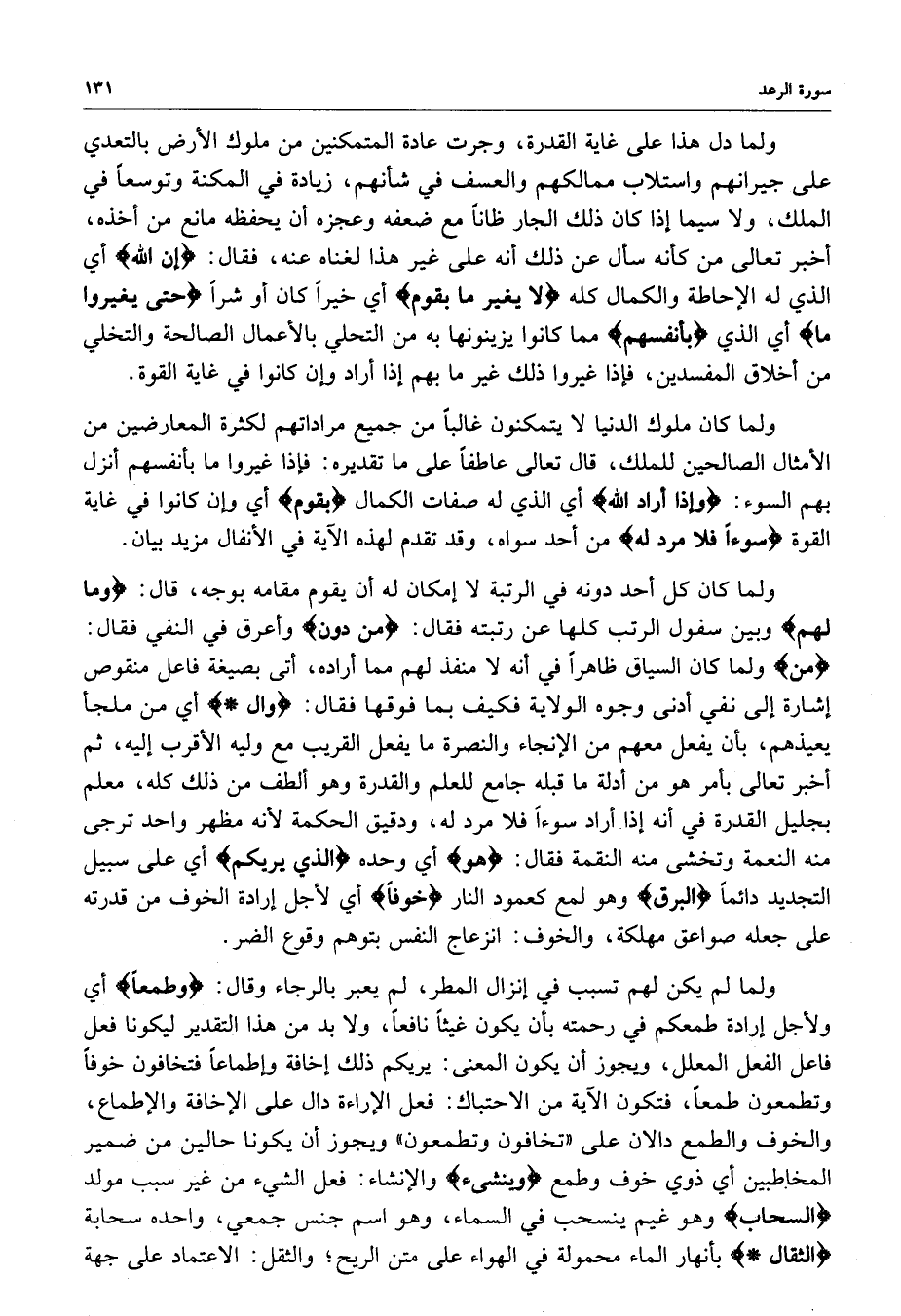 ولما كان كل أحد دونه في الرتبة لا إمكان له أن يقوم مقامه بوجه ، قال : ( وما لهم وبين سفول الرتب كلها عن رتبته فقال : ( من دون ( وأعرق في النفي فقال : ( من ( ولما كان السياق ظاهراً في أنه لا منفذ لهم مما أراده ، أتى بصيغة فاعل منقوص إشارة إلى نفي أدنى وجوه الولاية فكيف بما فوقها فقال : ( وال ) أي من ملجأ يعيذهم ، بأن الفعل معهم من الإنجاء والنصرة ما يفعل القريب مع وليه الأقرب إليه ، ثم أخبر تعالى بأمر هو أدلة ما قبله جامع للعلم والقدرة وهو ألطف من ذلك كله ، معلم بجليل القدرة في أنه إذا أراد سوءاً فلا مرد له ، ودقيق الحكمة لأنه مظهر واحد ترجى منه النعمة وتخشى منه النقمة فقال : ( هو ) أي وحده ) الذي يريكم ) أي على سبيل التجديد دائماً ) البرق ( وهو لمع كعمود النار ) خوفاً ) أي لأجل إرادة الخوف من قدرته على جعله صواعق مهلكة ، والخوف : انزعاج النفس بتوهم وقوع الضر .