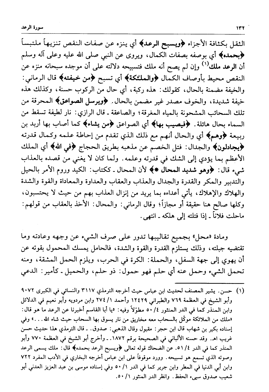 الثقل بكثافة الأجزاء ) ويسبح الرعد ) أي ينزه عن صفات النقص تنزيهاً ملتبساً ) بحمده ) أي بوصفه بصفات الكمال ، ويروى عن النبي صلى الله عليه وعلى آله وسلم أن ) الرعك ملك ( وإن لم يصح أنه ملك فتسبيحه دلالته على أن موجده سبحانه منزه عن النقص محيط بأوصاف الكمال ) والملائكة ) أي تسبح ) من خيفته ( قال الرماني : والخيفة مضمنة بالحال ، كقولك : هذه ركبة ، أي حال من الركوب حسنة ، وكذلك هذه خيفة شديدة ، والخوف مصدر غير مضمن بالحال .