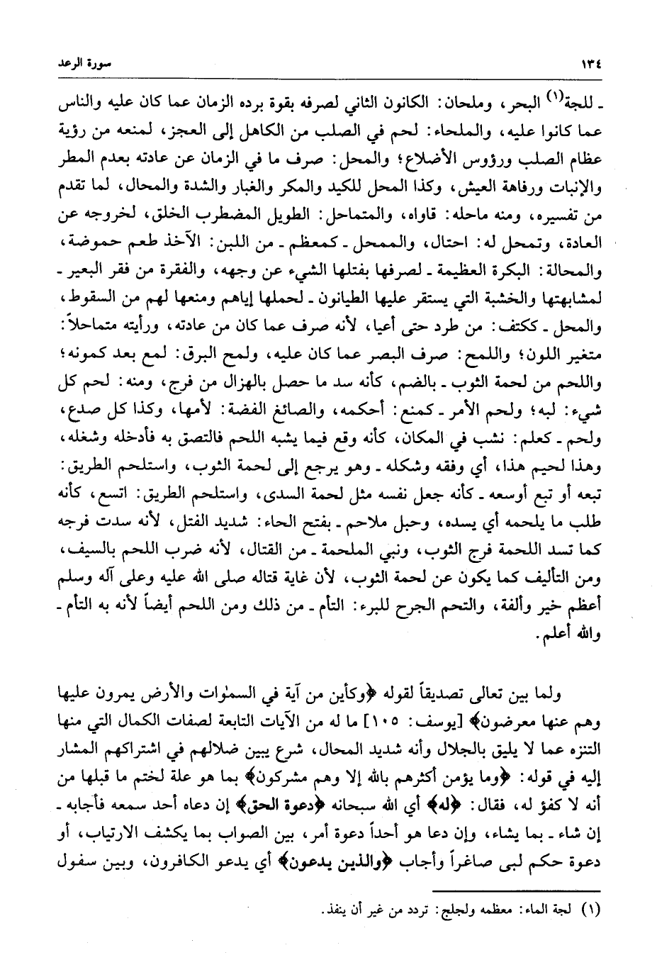للجة البحر ، وملحان : الكانون الثاني لصرفه بقوة برده الزمان عما كان عليه والناس عما كانوا عليه ، والملحاء : لحم في الصلب من الكاهل إلى العجز ، لمنعه من رؤية عظام الصلب ورؤوس الأضلاع ؛ والمحل صرف ما في الزمان عن عادته بعدم المطر والإنبات ورفاهة العيش ، وكذا المحل للكيد والمكر والغبار والشدة والمحال ، لما تقدم من تفسيره ، ومنه ما حله : قاواه ، والمتحامل : الطويل المضطرب الخلق ، لخروجه عن العادة ، وتمحل له : احتال ، والممحل - كمعظم - من اللبن : الآخذ طعم حموضة ، والمحالة : البكرة العظيمة - لصرفها بفتلها الشيء عن وجهه ، والفقرة من فقر البعير - لمشابهتها والخشبة التي يستقر عليها الطيانون - لحملها إياهم ومنعها لهم من السقوط ، والمحل - ككتف : من طرد حتى أعيا ، لأنه صرف عما كان من عادته ، ورأيته متماحلاً : متغير اللون ؛ واللمح : صرف البصر عما كان عليه ، ولمح البرق : لمع بعد كمونه ؛ واللحم من لحمة الثوب - بالضم ، كأنه سد ما حصل بالهزال من فرج ، ومنه : لحم كل شيء : لبه ؛ ولحم الأمر - كمنع : أحكمه ، والصائغ الفضة : لأمها ، وكذا كل صدع ، ولحم - كعلم : نشب في المكان ، كأنه وقع فيما يشبه اللحم فالتصق به فأدخله وشغله ، وهذا لحيم هذا ، أي وفقه وشكله - وهو يرجع إلى لحمة الثوب ، واستلحم الطريق : تبعه أو تبع أوسعه - كأنه جعل نفسه مثل لحمة السدى ، واستلحم الطريق : اتسع ، كأنه طلب ما يلحمه أي يسده ، وحبل ملاحم - بفتح الحاء : شديد الفتل ، لأنه سدت فرجه كما تسد اللحمة فرج الثوب ، ونبي الملحمة - من القتال ، لأنه ضرب اللحم بالسيف ، ومن التأليف كما يكون عن لحمة الثوب ، لأن غاية قتاله صلى الله عليه وعلى آله وسلم أعظم خير وألفة ، والتحم الجرح للبرء : التأم - من ذلك ومن اللحم أيضاً لأنه به التأم - والله أعلم .