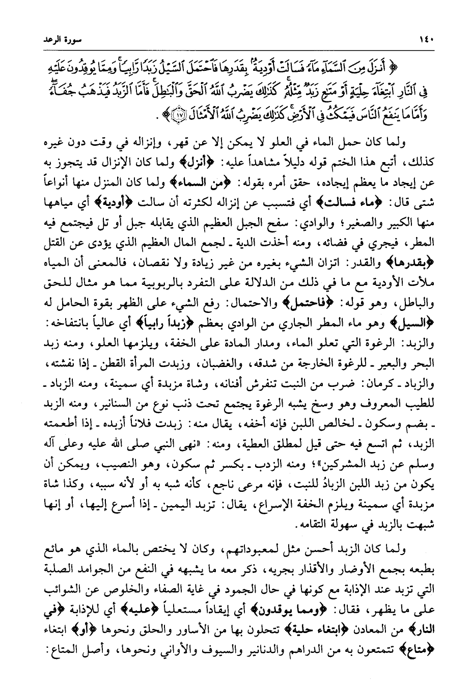 ) أَنَزَلَ مِنَ السَّمَآءِ مَآءً فَسَالَتْ أَوْدِيَةٌ بِقَدَرِهَا فَاحْتَمَلَ السَّيْلُ زَبَداً رَّابِياً وَمِمَّا يُوقِدُونَ عَلَيْهِ فِي النَّارِ ابْتِغَآءَ حِلْيَةٍ أَوْ مَتَاعٍ زَبَدٌ مِّثْلُهُ كَذلِكَ يَضْرِبُ اللَّهُ الْحَقَّ وَالْبَاطِلَ فَأَمَّا الزَّبَدُ فَيَذْهَبُ جُفَآءً وَأَمَّا مَا يَنفَعُ النَّاسَ فَيَمْكُثُ فِي الأَرْضِ كَذلِكَ يَضْرِبُ اللَّهُ الأَمْثَالَ ( ( )