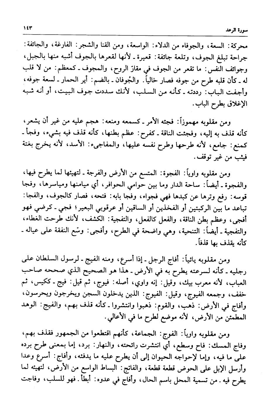 ومن مقلوبه واوياً : الفجوة : المتسع من الأرض والفرجة - لتهيئها لما يطرح فيها ، والفجوة - أيضاً : ساحة الدار وما بين حوافي الحوافر ، أي ميامنها ومياسرها ، وفجا قوسه : رفع وترها عن كبدها فهي فجواء ، وفجا بابه : فتحه ، فصار كالجوف ، والفجا : تباعد ما بين الركبتين أو الفخذين أو الساقين أو عرقوبي البعير ؛ فجي - كرضي فهو أفجى ، وعظم بطن الناقة ، والفعل كالفعل ، والتفجية : الكشف ، لأنك طرحت الغطاء ، والتفجية - أيضاً : التنحية ، وهي واضحة في الطرح ، وأفجى : وسّع النفقة على عياله - كأنه يقذف بها قذفاً .