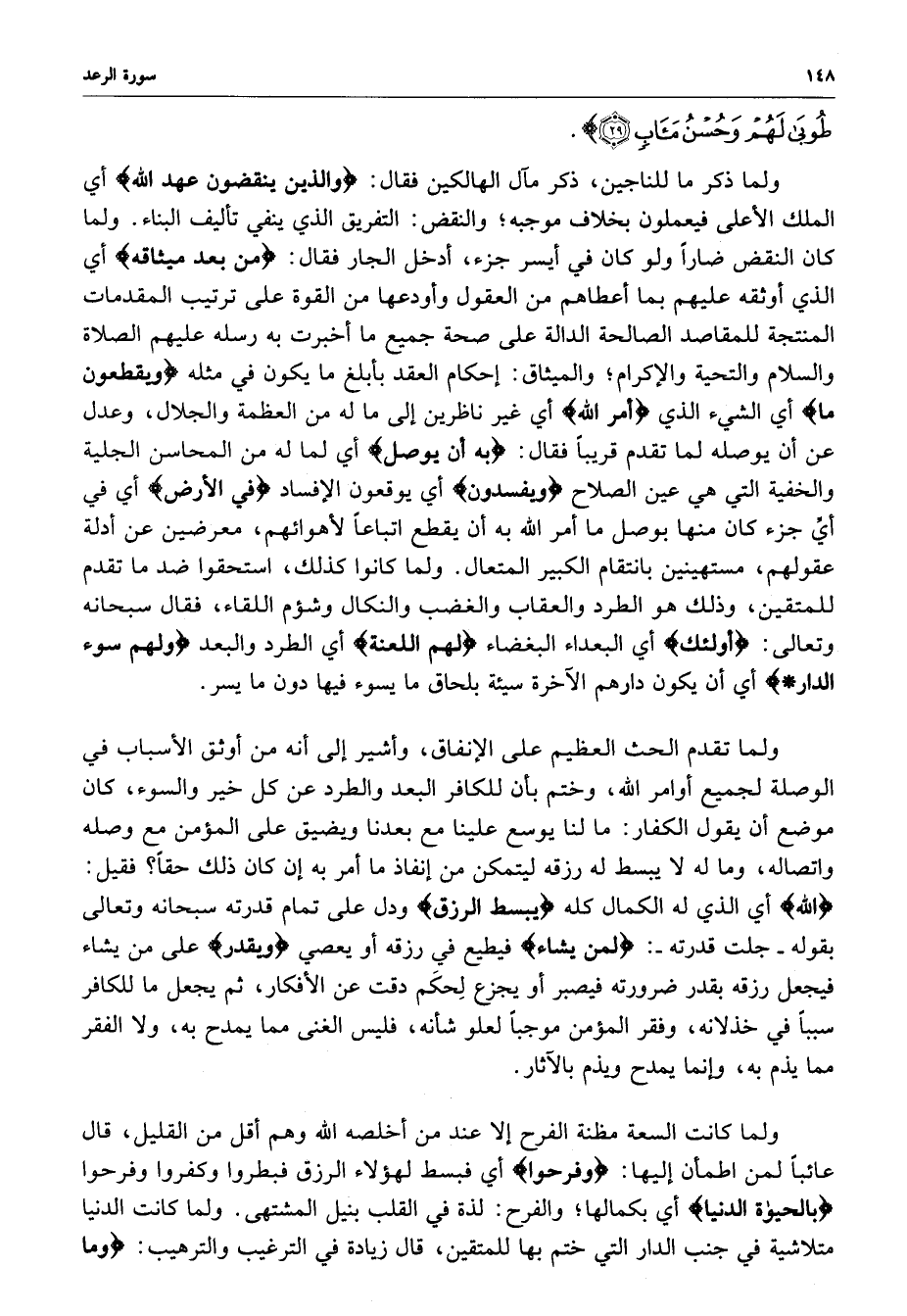 ولما تقدم الحث العظيم علىالإنفاق ، وأشير إلى أنه من أوثقى الأسباب في الوصلة لجميع أوامر الله ، وختم بأن للكافر البعد والطرد عن كل المؤمن مع وصله واتصاله ، وما له لا يبسط له رزقه ليتمكن من إنفاذ ما أمر به إن كان ذلك حقاً ؟ فقيل : ( الله ) أي الذي له الكمال كله ) يبسط الرزق ( ودل على تمام قدرته سبحانه وتعالى بقوله - جلت قدرته - : ( لمن يشاء ( فيطيع في رزقه أو يعصي ) ويقدر ( على من يشاء فيجعل رزقه بقدر ضرورته فيصبر أو يجزع لِحكَم دقت عن الأفكار ، ثم جعل ما للكافر سبباً في خذلانه ، وفقر المؤمن موجباً لعلو شأنه ، فليس الغنى مما يمدح به ، ولا الفقر مما يذم به ، وإنما يمدح ويذم بالآثار .
