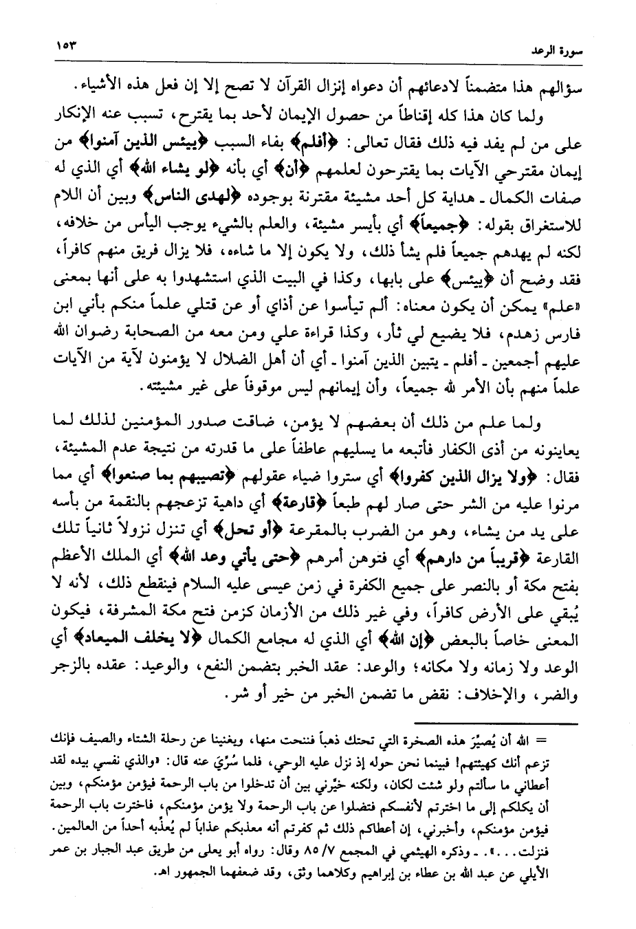 ولما كان هذا كله إقناطاً من حصول الإيمان لأحد بما يقترح ، تسبب عنه الإنكار على من لم يفد فيه ذلك فقال تعالى : ( أفلم ( بفاء السبب ) ييئس الذين آمنوا ( من إيمان مقترحي الآيات بما يقترحون لعلمهم ) أن ) أي بأنه ) لهدى الناس ( وبين أن اللام للاستغراق بقوله : ( جميعاً ) أي بأيسر مشيئة ، والعلم بالشيء يوجب اليأس من خلافه ، لكنه لم يهدهم جميعاً فلم يشأ ذلك ، ولا يكون إلا ما شاءه ، فلا يزال فريق منهم كافراً ، فقد وضح أن ) ييئس ( على بابها ، وكذا في البيت الذي استشهدوا به على أنها بمعنى ( علم ) يمكن أن يكون معناه : ألم تيأسوا عن أذاي أو عن قتلي علماً منكم بأني ابن فارس زهدم ، فلا يضيع لي ثأر ، وكذا قراءة علي ومن معه من الصحابة رضوان الله عليهم أجمعين - أفلم - يتبين الذين آمنوا - أي أن أهل الضلال لا يؤمنون لآية من الآيات علماً منهم بأن الأمر لله جميعاً ، وأن إيمانهم ليس موقوفاً على غير مشيئته .