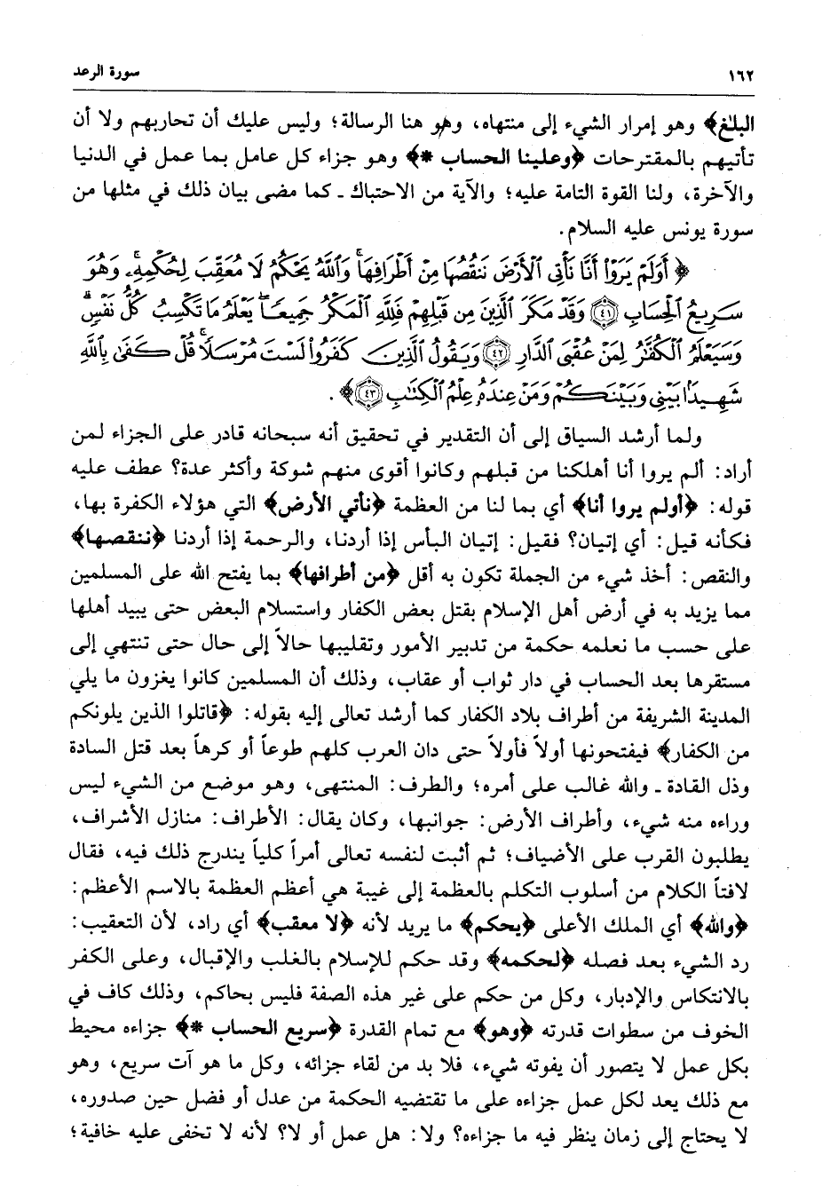 ) أَوَلَمْ يَرَوْاْ أَنَّا نَأْتِي الأَرْضَ نَنقُصُهَا مِنْ أَطْرَافِهَا وَاللَّهُ يَحْكُمُ لاَ مُعَقِّبَ لِحُكْمِهِ وَهُوَ سَرِيعُ الْحِسَابِ وَقَدْ مَكَرَ الَّذِينَ مِن قَبْلِهِمْ فَلِلَّهِ الْمَكْرُ جَمِيعاً يَعْلَمُ مَا تَكْسِبُ كُلُّ نَفْسٍ وَسَيَعْلَمُ الْكُفَّارُ لِمَنْ عُقْبَى الدَّارِ وَيَقُولُ الَّذِينَ كَفَرُواْ لَسْتَ مُرْسَلاً قُلْ كَفَى بِاللَّهِ شَهِيداً بَيْنِي وَبَيْنَكُمْ وَمَنْ عِندَهُ عِلْمُ الْكِتَابِ ( ( )
