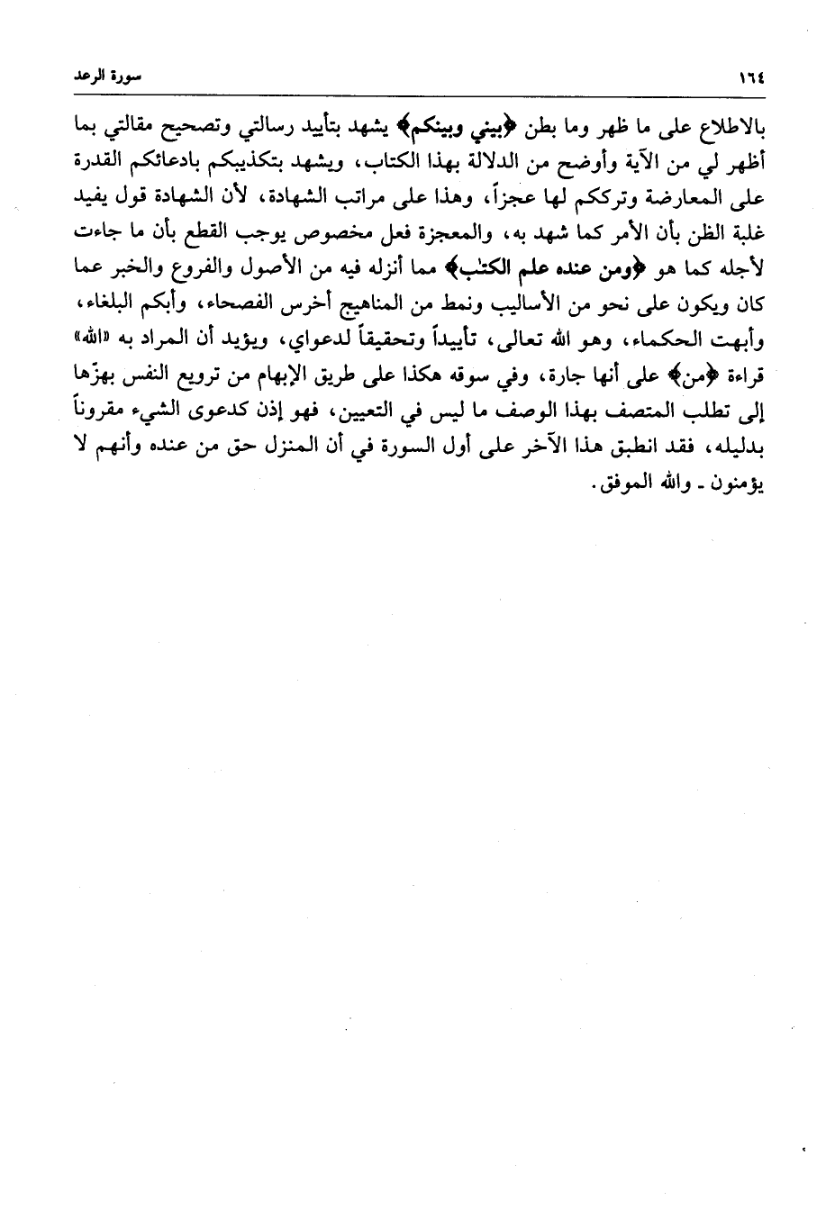 بالاطلاع على ما ظهر وما بطن ) بيني وبينكم ( يشهد بتأييد رسالتي وتصحيح مقالتي بما أظهر لي من الآية وأوضح من الدلالة بهذا الكتاب ، ويشهد بتكذيبكم بادعائكم القدرة على المعارضة وترككم لها عجزاً ، وهذا على مراتب الشهادة ، لأن الشهادة قول يفيد غلبة الظن بأن الأمر كما شهد به ، والمعجزة فعل مخصوص يوجب القطع بأن ما جاءت لأجله كما هو ) ومن عنده علم الكتاب ( مما أنزله فيه من الأصول والفروع والخبر عما كان يكون على نحو من الأساليب ونمط من المناهيج أخرس الفصحاء ، وأبكم البلغاء ، وأبهت الحكماء ، وهو الله تعالى ، تأييداً وتحقيقاً لدعواي ، ويؤيد أن المراد به ( الله ) قراءة ) من ( على أنها جارة ، وفي سوقه هكذا على طريق الإبهام من ترويع النفس بهزّها إلى تطلب المتصف بهذا الوصف ما ليس في التعيين ، فهو إذن كدعوى الشيء مقروناً بدليله ، فقد انطبق هذا الآخر على أول السورة في أن المنزل حق من عنده وأنهم لا يؤمنون - والله الموفق .