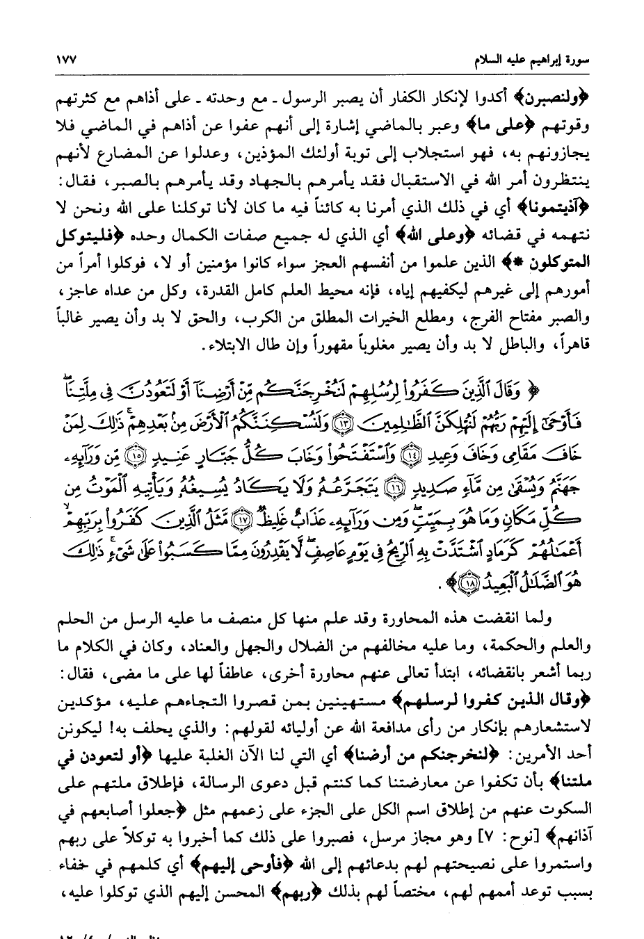 ) وَقَالَ الَّذِينَ كَفَرُواْ لِرُسُلِهِمْ لَنُخْرِجَنَّكُمْ مِّنْ أَرْضِنَآ أَوْ لَتَعُودُنَّ فِي مِلَّتِنَا فَأَوْحَى إِلَيْهِمْ رَبُّهُمْ لَنُهْلِكَنَّ الظَّالِمِينَ وَلَنُسْكِنَنَّكُمُ الأَرْضَ مِن بَعْدِهِمْ ذلِكَ لِمَنْ خَافَ مَقَامِي وَخَافَ وَعِيدِ وَاسْتَفْتَحُواْ وَخَابَ كُلُّ جَبَّارٍ عَنِيدٍ مِّن وَرَآئِهِ جَهَنَّمُ وَيُسْقَى مِن مَّآءٍ صَدِيدٍ يَتَجَرَّعُهُ وَلاَ يَكَادُ يُسِيغُهُ وَيَأْتِيهِ الْمَوْتُ مِن كُلِّ مَكَانٍ وَمَا هُوَ بِمَيِّتٍ وَمِن وَرَآئِهِ عَذَابٌ غَلِيظٌ مَّثَلُ الَّذِينَ كَفَرُواْ بِرَبِّهِمْ أَعْمَالُهُمْ كَرَمَادٍ اشْتَدَّتْ بِهِ الرِّيحُ فِي يَوْمٍ عَاصِفٍ لاَّ يَقْدِرُونَ مِمَّا كَسَبُواْ عَلَى شَيْءٍ ذلِكَ هُوَ الضَّلاَلُ الْبَعِيدُ ( ( )