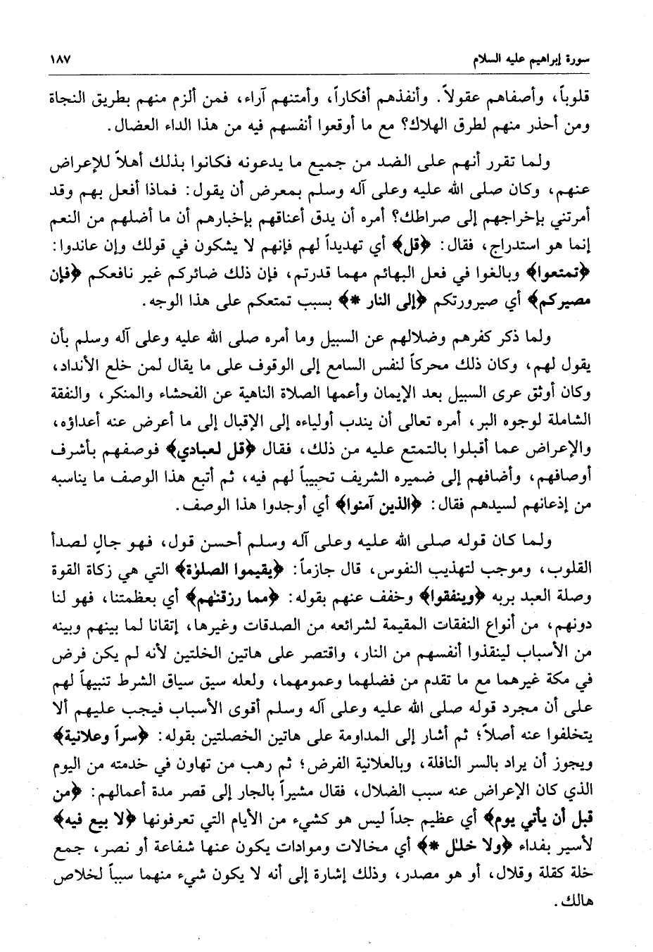 ولما كان قوله صلى الله عليه وعلى آله وسلم أحسن قول ، فهو جالٍ لصدأ القلوب ، وموجب لتهذيب النفوس ، قال جازماً : ( يقيموا الصلاة ( التي هي زكاة القوة وصلة العبد بربه ) وينفقوا ( وخفف عنهم بقوله : ( مما رزقناهم ) أي بعظمتنا ، فهو لنا دونهم ، من أنواع النفقات المقيمة لشرائعه من الصدقات وغيرها ، إتقاناً لما بينهم وبينه من الأسباب لينقذوا أنفسهم من النار ، واقتصر على هاتين الخلتين لأنه لم يكن فرض في مكة غيرهما مع ما تقدم من فضلهما وعمومهما ، ولعله سيق سياق الشرط تنبيهاً لهم على أن مجرد قوله ( صلى الله عليه وسلم ) وعلى آله وسلم أقوى الأسباب فيجب عليهم ألا يتخلفوا عنه أصلاً ؛ ثم أشار إلى المداومة على هاتين الخصلتين بقوله : ( سرأ وعلانية ( ويجوز أن يراد بالسر النافلة ، وبالعلانية الفرض ؛ ثم رهب من تهاون في خدمته من اليوم الذي كان الإعراض عنه سبب الضلال ، فقال مشيراً بالجار إلى قصر مدة أعمالهم : ( من قبل أن يأتي يوم ) أي عظيم جداً ليس هو كشيء من الأيام التي تعرفونها ) إلا بيع فيه ( لأسير بفداء ) ولا خلال ) أي مخالات وموادات يكون عنها شفاعة أو نصر ، جمع خلة كقلة وقلال ، أو هو مصدر ، وذلك إشارة إلى أنه لا يكون شيء منهما سبباً لخلاص هالك .