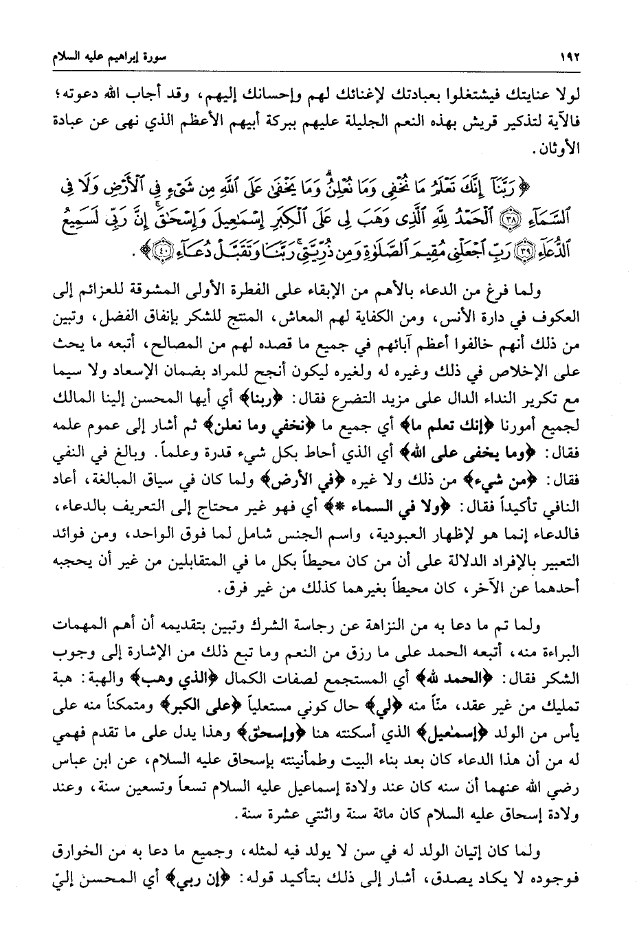 ) رَبَّنَآ إِنَّكَ تَعْلَمُ مَا نُخْفِي وَمَا نُعْلِنُ وَمَا يَخْفَى عَلَى اللَّهِ مِن شَيْءٍ فَي الأَرْضِ وَلاَ فِي السَّمَآءِ الْحَمْدُ للَّهِ الَّذِي وَهَبَ لِي عَلَى الْكِبَرِ إِسْمَاعِيلَ وَإِسْحَاقَ إِنَّ رَبِّي لَسَمِيعُ الدُّعَآءِ رَبِّ اجْعَلْنِي مُقِيمَ الصَّلاَةِ وَمِن ذُرِّيَتِي رَبَّنَا وَتَقَبَّلْ دُعَآءِ ( ( )