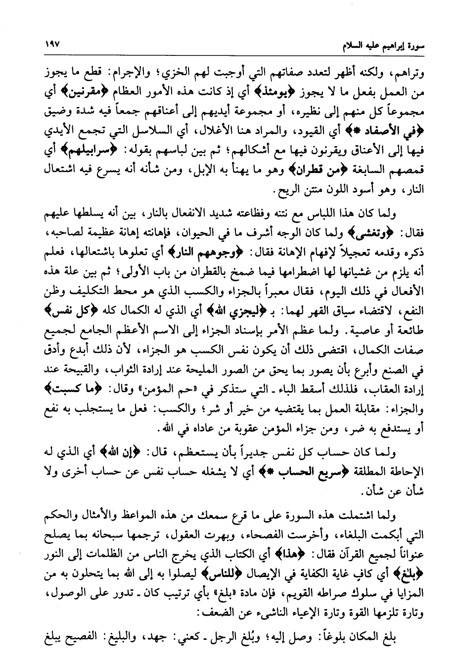 ولما كان هذا اللباس مع نتنه وفظاعته شديد الانفعال بالنار ، بين أنه يسلطها عليهم فقال : ( وتغشى ( ولما كان الوجه أشرف ما في الحيوان ، فإهانته إهانة عظيمة لصاحبه ، ذكره وقدمه تعجيلاً لإفهام الإهانة فقال : ( وجوههم النار ) أي تعلوها باشتعالها ، فعلم أنه يلزم من غشيانها لها اضطرابها فيما ضمخ بالقطران من باب الأولى ؛ ثم بين علة هذه الأفعال في ذلك اليوم ، فقال معبراً بالجزاء والكسب الذي هو محط التكليف وظن النفع ، لاقتضاء سياق القهر لهما : ب ) ليجزي الله ) أي الذي له الكمال كله ) كل نفس ( طائعة أوعاصية .