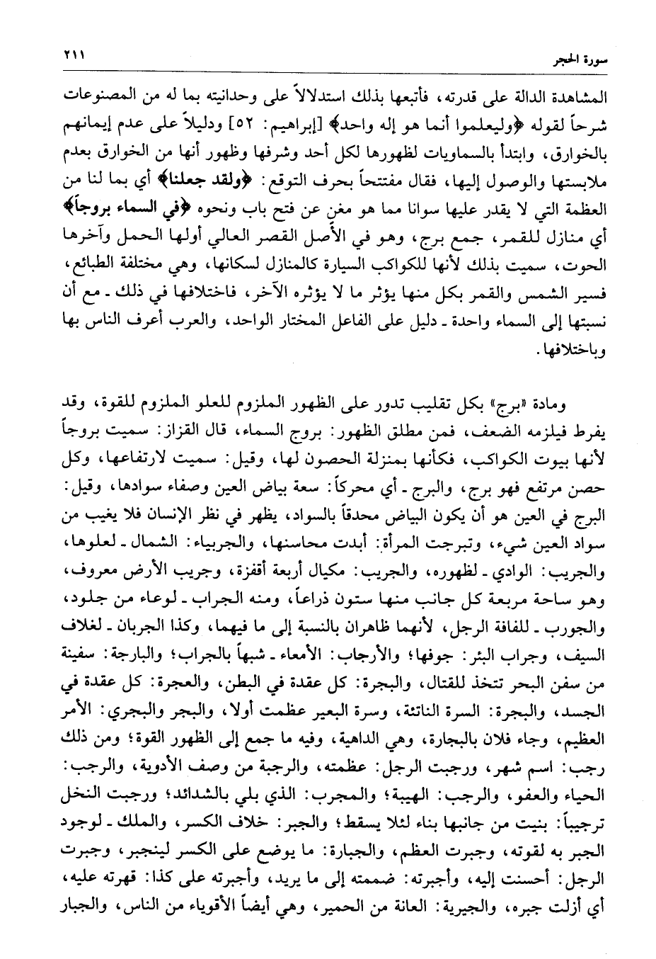 ومادة ( برج ) بكل تقليب تدور على الظهور الملزوم للعلو الملزوم للقوة ، وقد يفرط فيلزمه الضعف ، فمن مطلق الظهور : بروج السماء ، قال القزاز : سميت بروجاً لأنها بيوت الكواكب ، فكأنها بمنزلة الحصون لها ، وقيل : سميت لارتفاعها ، وكل حصن مرتفع فهو برج ، والبرج - أي محركاً : سعة بياض العين وصفاء سوادها ، وقيل : البرج في العين هو أن يكون البياض محدقاً بالسواد ، يظهر في نظر الإنسان فلا يغيب من سواد العين شيء ، وتبرجت المرأة : أبدت محاسنها ، والجربياء : الشمال - لعلوها ، والجريب : الوادي - لظهوره ، والجريب : مكيال أربعة أقفزة ، وجريب الأرض معروف ، وهو ساحة مربعة كل جانب منها ستون ذراعاً ، ومنه الجراب - لوعاء من جلود ، والجورب - للفافة الرجل ، لأنهما ظاهران بالنسبة إلى ما فيهما ، وكذا الجربان - لغلاف السيف ، وجرب البئر : جوفها ؛ والأجارب : الأمعاء - شبهاً بالجراب ؛ والبارجة : سفينة من سفن البحر تتخذ للقتال ، والبجرة : كل عقدة في البطن ، والعجرة : كل عقدة في الجسد ، والبجرة : السرة الناتئة ، وسرة البعير عظمت أولاً ، والبجر والبجري : الأمر العظيم ، وجاء فلان بالبجارة ، وهي الداهية : وفيه ما جمع إلى الظهور القوة ؛ ومن ذلك رجب : اسم شهر ، ورجبت الرجل : عظمته ، والرجبة من وصف الأدوية ، والرجب : الحياء والعفو ، والرجب : الهيبة ؛ والمجرب : الذي بلي بالشدائد ؛ ورجبت النخل ترحيباً : بنيت من جانبها بناء لئلا يسقط ؛ والجبر : خلاف الكسر ، والملك - لوجود الجبر به لقوته ، وجبرت العظم ، والجبارة : ما يوضع على الكسر لينجبر ، وجبرت الرجل : أحسنت إليه ، وأجبرته : ضممته إلى ما يريد ، وأجبرته على كذا : قهرته عليه ، أي أزلت جبره ، والجيرية : العانة من الحمير ، وهي أيضاً الأقوياء من الناس ، والجبار
