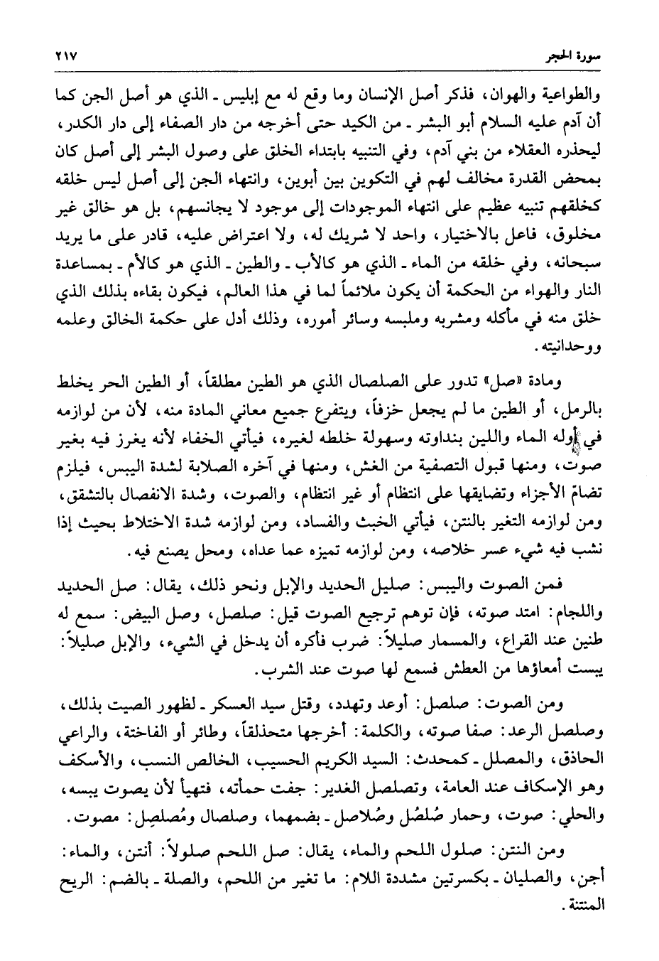 والطواعية والهوان ، فذكر أصل الإنسان وما وقع له من إبليس - الذي هو أصل الجن كما أن آدم عليه السلام أبو البشر - من الكيد حتى أخرجه من دار الصفاء إلى دار الكدر ، ليحذره العقلاء من بني آدم ، وفي التنبيه بابتداء الخلق على وصول البشر إلى أصل كان بمحض القدرة مخالف لهم في التكوين بين أبوين ، وانتهاء الجن إلى أصل ليس خلقه كخلقهم تنبيه عظيم على انتهاء الموجودات إلى موجود لا يجانسهم ، بل هو خالق غير مخلوق ، فاعل بالاختيار ، واحد لا شريك له ، ولا اعتراض عليه ، قادر على ما يريد سبحانه ، وفي خلقه من الماء - الذي هو كالأب - والطين - الذي هو كالأم - بمساعدة النار والهواء من الحكمة أن يكون ملائماً لما في هذا العالمن فيكون بقاءه بذلك الذي خلق منه في مأكله ومشربه وملبسه وسائر أموره ، وذلك أدل على حكمة الخالق وعلمه ووحدانيته .