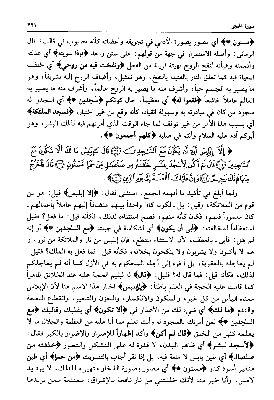 ) إِلاَّ إِبْلِيسَ أَبَى أَن يَكُونَ مَعَ السَّاجِدِينَ قَالَ يإِبْلِيسُ مَا لَكَ أَلاَّ تَكُونَ مَعَ السَّاجِدِينَ قَالَ لَمْ أَكُن لأَسْجُدَ لِبَشَرٍ خَلَقْتَهُ مِن صَلْصَالٍ مِّنْ حَمَإٍ مَّسْنُونٍ قَالَ فَاخْرُجْ مِنْهَا فَإِنَّكَ رَجِيمٌ وَإِنَّ عَلَيْكَ اللَّعْنَةَ إِلَى يَوْمِ الدِّينِ ( ( )