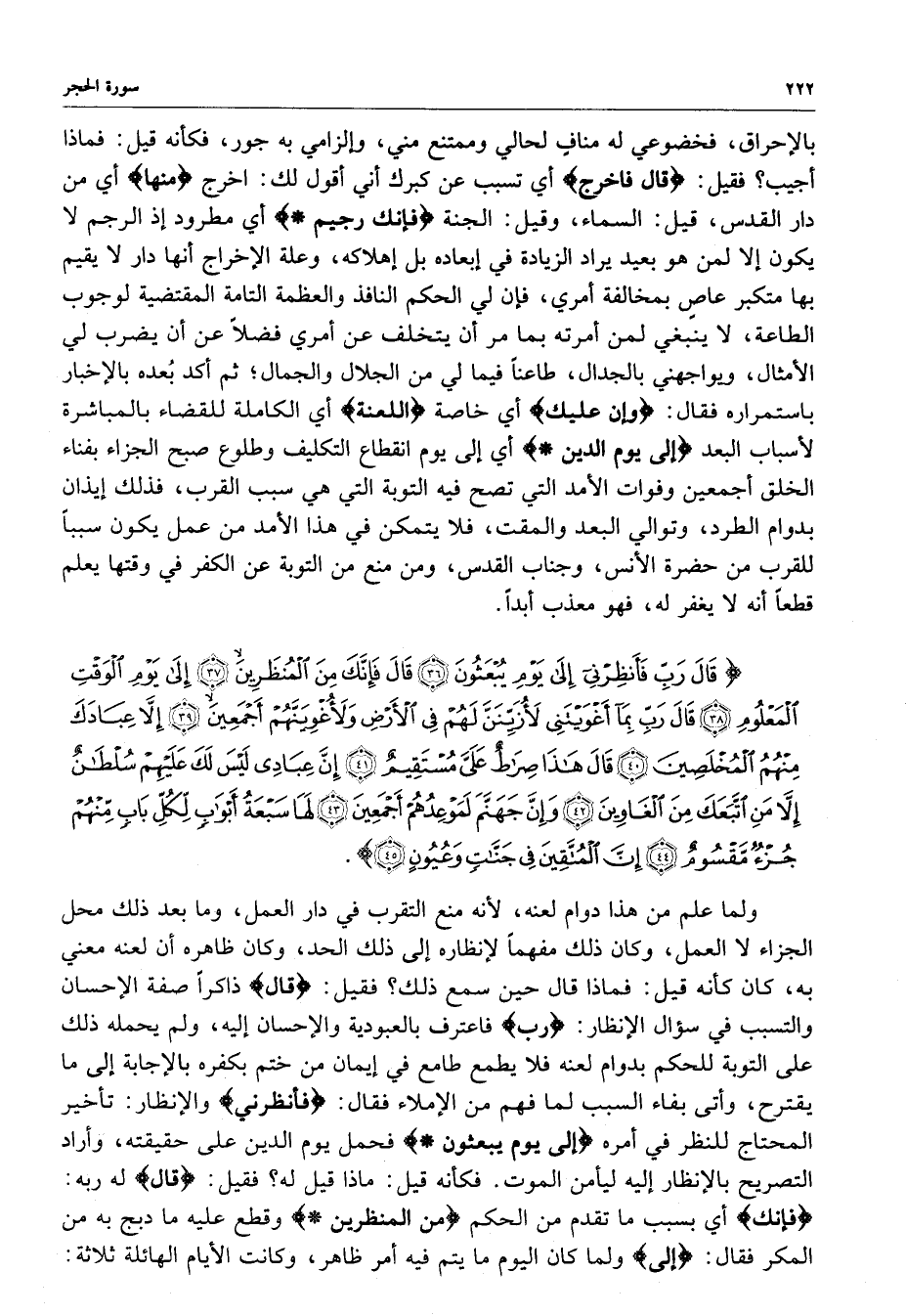 ) قَالَ رَبِّ فَأَنظِرْنِي إِلَى يَوْمِ يُبْعَثُونَ قَالَ فَإِنَّكَ مِنَ الْمُنظَرِينَ إِلَى يَوْمِ الْوَقْتِ الْمَعْلُومِ قَالَ رَبِّ بِمَآ أَغْوَيْتَنِي لأُزَيِّنَنَّ لَهُمْ فِي الأَرْضِ وَلأُغْوِيَنَّهُمْ أَجْمَعِينَ إِلاَّ عِبَادَكَ مِنْهُمُ الْمُخْلَصِينَ قَالَ هَذَا صِرَاطٌ عَلَيَّ مُسْتَقِيمٌ إِنَّ عِبَادِي لَيْسَ لَكَ عَلَيْهِمْ سُلْطَانٌ إِلاَّ مَنِ اتَّبَعَكَ مِنَ الْغَاوِينَ وَإِنَّ جَهَنَّمَ لَمَوْعِدُهُمْ أَجْمَعِينَ لَهَا سَبْعَةُ أَبْوَابٍ لِكُلِّ بَابٍ مِّنْهُمْ جُزْءٌ مَّقْسُومٌ إِنَّ الْمُتَّقِينَ فِي جَنَّاتٍ وَعُيُونٍ ( ( )