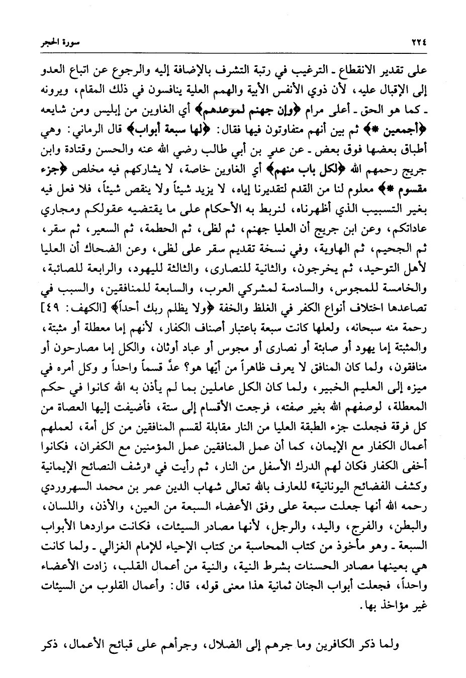 [ الكهف : 49 ] رحمة منه سبحانه ، ولعلها كانت سبعة باعتبار أصناف الكفار ، لأنهم إما معطلة أو مثبتة ، والمثبتة إما يهود أو صابئة أو نصارى أو أو مجوس أو عباد أوثان ، والكل إما مصارحون أو منافقون ، ولما كان المنافق لا يعرف ظاهراً من أيّها هو ؟ عدَّ قسماً واحداً ووكل أمره في ميزه إلى العليم الخبير ، ولما كان الكل عاملين بما لم يأذن به الله كانوا في حكم المعطلة ، لوصفهم الله بغير صفته ، فرجعت الأقسام إلى ستة ، فأضيفت إليها العصاة من كل فرقة فجعلت جزء الطبقة العليا من النار مقابلة لقسم المنافقين من كل أمة ، لعملهم أعمال الكفار مع الإيمان ، كما أن عمل المنافقين عمل المؤمنين مع الكفران ، فكانوا أخفى الكفار فكان لهم الدرك الأسفل من النار ، ثم رأيت في ( رشف النصائح الإيمانية وكشف الفضائح اليونانية ) للعارف بالله تعالى شهاب الدين عمر بن محمد السهروردي رحمه الله أنها جعلت سبعة على وفق الأعضاء السبعة من العين ، والأذن ، واللسان ، والبطن ، والفرج ، واليد ، والرجل ، لأنها مصادر السيئات ، فكانت مواردها الأبواب السبعة - وهو مأخوذ من كتاب المحاسبة من كتاب الإحياء للإمام الغزالي - ولما كانت هي بعينها مصادر الحسنات بشرط النية ، والنية من أعمال القلب ، زادت الأعضاء واحداً ، فجعلت أبواب الجنان ثمانية هذا معنى قوله ، قال : وأعمال القلوب من السيئات غير مؤاخذ بها .