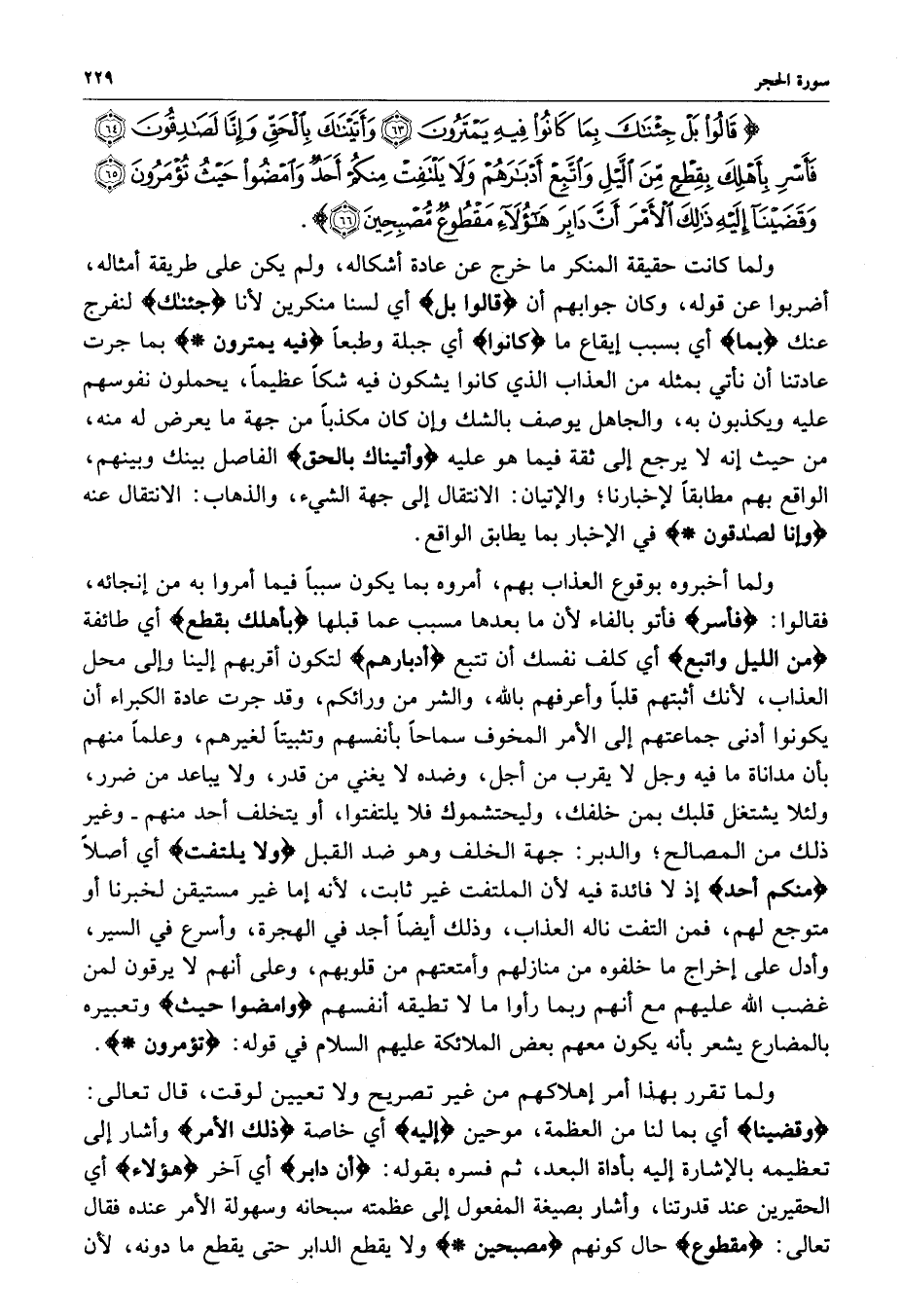) قَالُواْ بَلْ جِئْنَاكَ بِمَا كَانُواْ فِيهِ يَمْتَرُونَ وَآتَيْنَاكَ بِالْحَقِّ وَإِنَّا لَصَادِقُونَ فَأَسْرِ بِأَهْلِكَ بِقِطْعٍ مِّنَ اللَّيْلِ وَاتَّبِعْ أَدْبَارَهُمْ وَلاَ يَلْتَفِتْ مِنكُمْ أَحَدٌ وَامْضُواْ حَيْثُ تُؤْمَرُونَ وَقَضَيْنَآ إِلَيْهِ ذَلِكَ الأَمْرَ أَنَّ دَابِرَ هَؤُلآءِ مَقْطُوعٌ مُّصْبِحِينَ ( ( )
