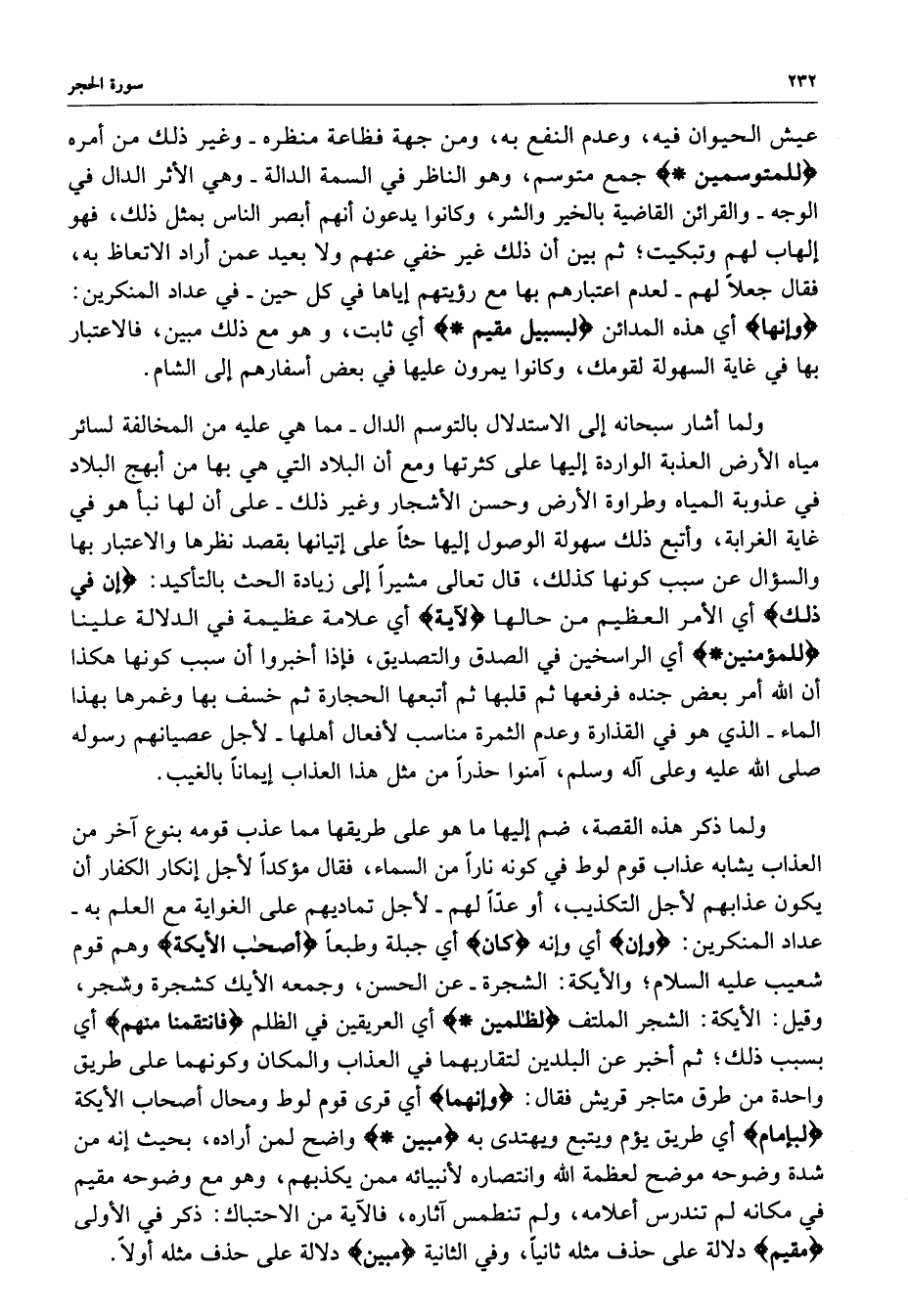 عيش الحيوان فيه ، وعدم النفع به ، ومن جهة فظاعة منظرة - وغير ذلك من أمره ) للمتوسمين ( جمع متوسم ، وهو الناظر في السمة الدالة - وهي الأثر ذلك ، فهو إلهاب لهم وتبكيت ؛ ثم بين أن ذلك غير خفي عنهم ولا بعيد عمن أراد الاتعاظ به ، فقال جعلاً لهم - لعدم اعتبارهم بها ومع رؤيتهم إياها في كل حين - في عداد المنكرين : ( وإنها ) أي هذه المدائن ) لبسبيل مقيم ) أي ثابت ، وهو مع ذلك مبين ، فالاعتبار بها في غاية السهولة لقومك ، وكانوا يمرون عليها في بعض أسفارهم إلى الشام .
