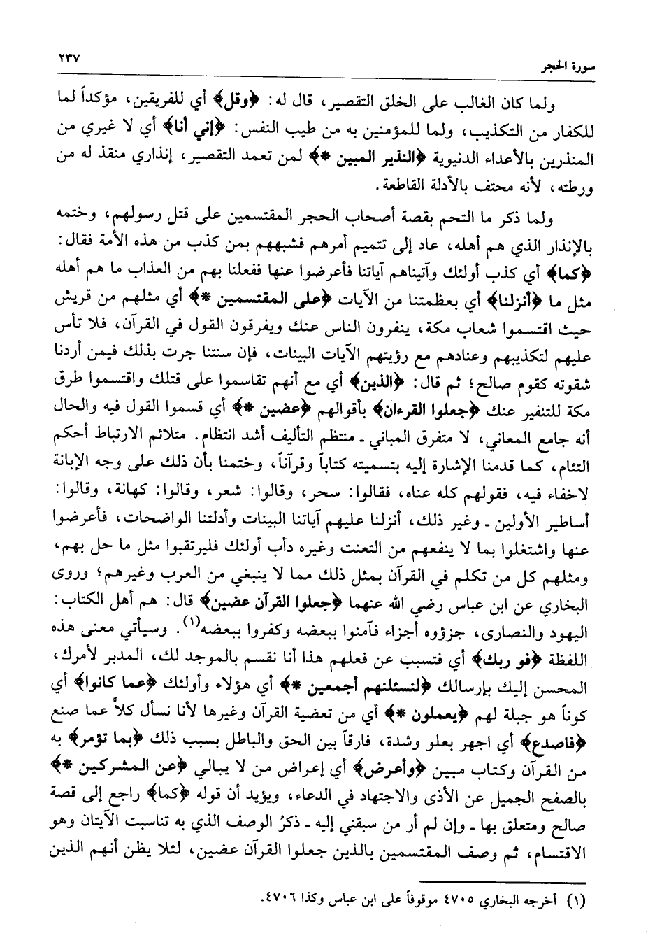 متلائم الارتباط أحكم التئام ، كما قدمنا الإشارة إليه بتسميته كتاباً وقرآناً ، وختمنا بأن ذلك على وجه الإبانة لاخفاء فيه ، فقولهم كله عناه ، فقالوا : سحر ، وقالوا : شعر ، وقالوا : كهانة ، وقالوا : أساطير الأولين - وغير ذلك ، أنزلنا عليهم آياتنا البينات وأدلتنا الواضحات ، فأعرضوا عنها واشتغلوا بما لا ينفعهم من التعنت وغيره دأب أولئك فليرتقبوا مثل ما حل بهم ، ومثلهم كل من تكلم في القرآن بمثل ذلك مما لا ينبغي من العرب وغيرهم ؛ وروى البخاري عن ابن عباس رضي الله عنهما ) جعلوا القرآن عضين ( قال : هم أهل الكتاب : اليهود والنصارى ، جزؤوه أجزاء فآمنوا ببعضه وكفروا ببعضه .