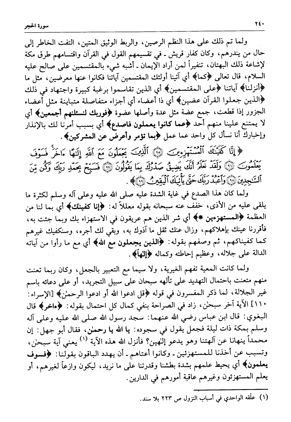 ) إِنَّا كَفَيْنَاكَ الْمُسْتَهْزِئِينَ الَّذِينَ يَجْعَلُونَ مَعَ اللَّهِ إِلهاً آخَرَ فَسَوْفَ يَعْمَلُونَ وَلَقَدْ نَعْلَمُ أَنَّكَ يَضِيقُ صَدْرُكَ بِمَا يَقُولُونَ فَسَبِّحْ بِحَمْدِ رَبِّكَ وَكُنْ مِّنَ السَّاجِدِينَ وَاعْبُدْ رَبَّكَ حَتَّى يَأْتِيَكَ الْيَقِينُ ( ( )