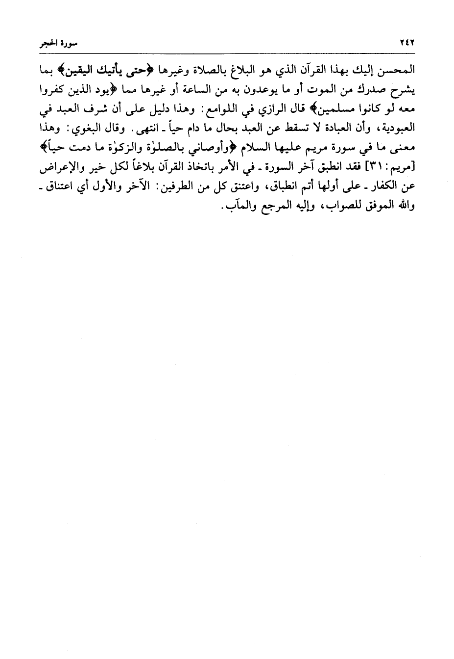 المحسن إليك بهذا القرآن الذي هو البلاغ بالصلاة وغيرها ) حتى يأتيك اليقين ( بما يشرح صدرك من الموت أو ما يوعدون به من الساعة أو غيرها مما ) يود الذين كفروا معه لو كانوا مسلمين ( قال الرازي في اللوامع : وهذا دليل على أن شرف العبد في العبودية ، وأن العبادة لا تسقط عن العبد بحال ما دام حياً - انتهى .