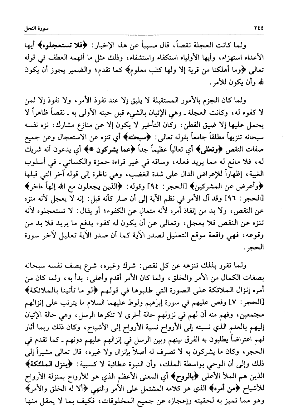 [ الحجر : 96 ] وقد آل الأمر في نظم الآية إلى أن صار كأنه قيل : إنه لا يعجل لأنه منزه عن النقص ، ولا بد من نفاذ أمره لأنه متعالٍ عن الكفوء ؛ أو يقال : لا تستعجلوه فلا بد من وقوعه ، فهي واقعة موقع التعليل لصدر الآية تعليل لآخر سورة الحجر .