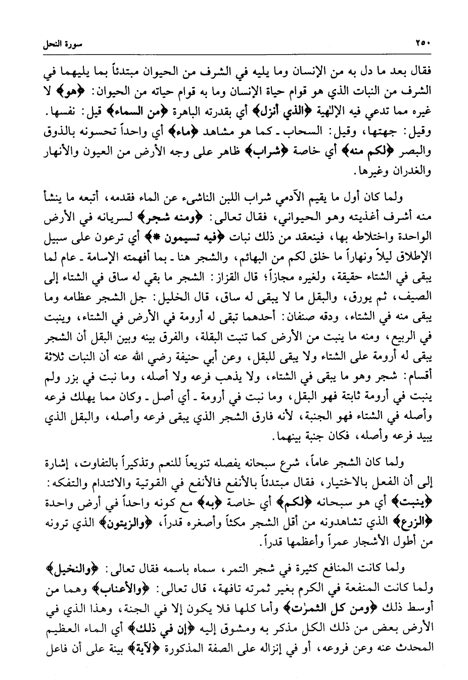 ولما كان أول ما يقيم الآدمي شراب اللبن الناشئ عن الماء فقدمه ، أتبعه ما ينشأ منه أشرف أغذيته وهو الحيواني ، فقال تعالى : ( ومنه شجر ( لسريانه في الأرض الواحدة واختلاطه بها ، فينعقد من ذلك نبات ) فيه تسيمون ) أي ترعون على سبيل الإطلاق ليلاً ونهاراً ما خلق لكم من البهائم ، والشجر هنا - بما أفهمته الإسامة - عام لما يبقى في الشتاء حقيقة ، ولغيره مجازاً ؛ قال القزاز : الشجر ما بقي له ساق في الشتاء إلى الصيف ، ثم يورق ، والبقل ما لايبقى له ساق ، قال الخليل : جل الشجر عظامه وما يبقى منه في الشتاء حقيقة ، ودقه صنفان : أحدهما تبقى له أورمة في الأرض في الشتاء ، وينبت في الربيع ، ومنه ما ينبت من الأرض كما تنبت البقلة ، والفرق بينه وبين البقل أن الشجر يبقى له أورمة على الشتاء ولا يبقى للبقل ، وعن أبي حنيفة رضي الله عنه أن النبات ثلاثة أقسام : شجر وهو ما يبقى في الشتاء ، ولا يذهب فرعه ولا أصله ، وما نبت ف برز ولم ينبت في أورمة ثابتة فهو البقل ، وما نبت في أورمة - أي أصل - وكان مما يهلك فرعه وأصله في الشتاء فهو الجنبة ، لأنه فارق الشجر الذي يبقى فرعه ولا أصله ، والبقل الذي يبيد فرعه وأصله ، فكان جنبة بينهما .