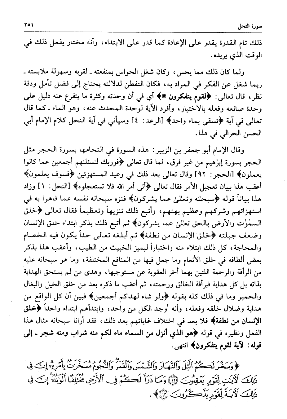 ) وَسَخَّرَ لَكُمُ اللَّيْلَ وَالْنَّهَارَ وَالشَّمْسَ وَالْقَمَرَ وَالْنُّجُومُ مُسَخَّرَاتٌ بِأَمْرِهِ إِنَّ فِي ذَلِكَ لآيَاتٍ لِّقَوْمٍ يَعْقِلُونَ وَمَا ذَرَأَ لَكُمْ فِي الأَرْضِ مُخْتَلِفاً أَلْوَانُهُ إِنَّ فِي ذَلِكَ لآيَةً لِّقَوْمٍ يَذَّكَّرُونَ ( ( )