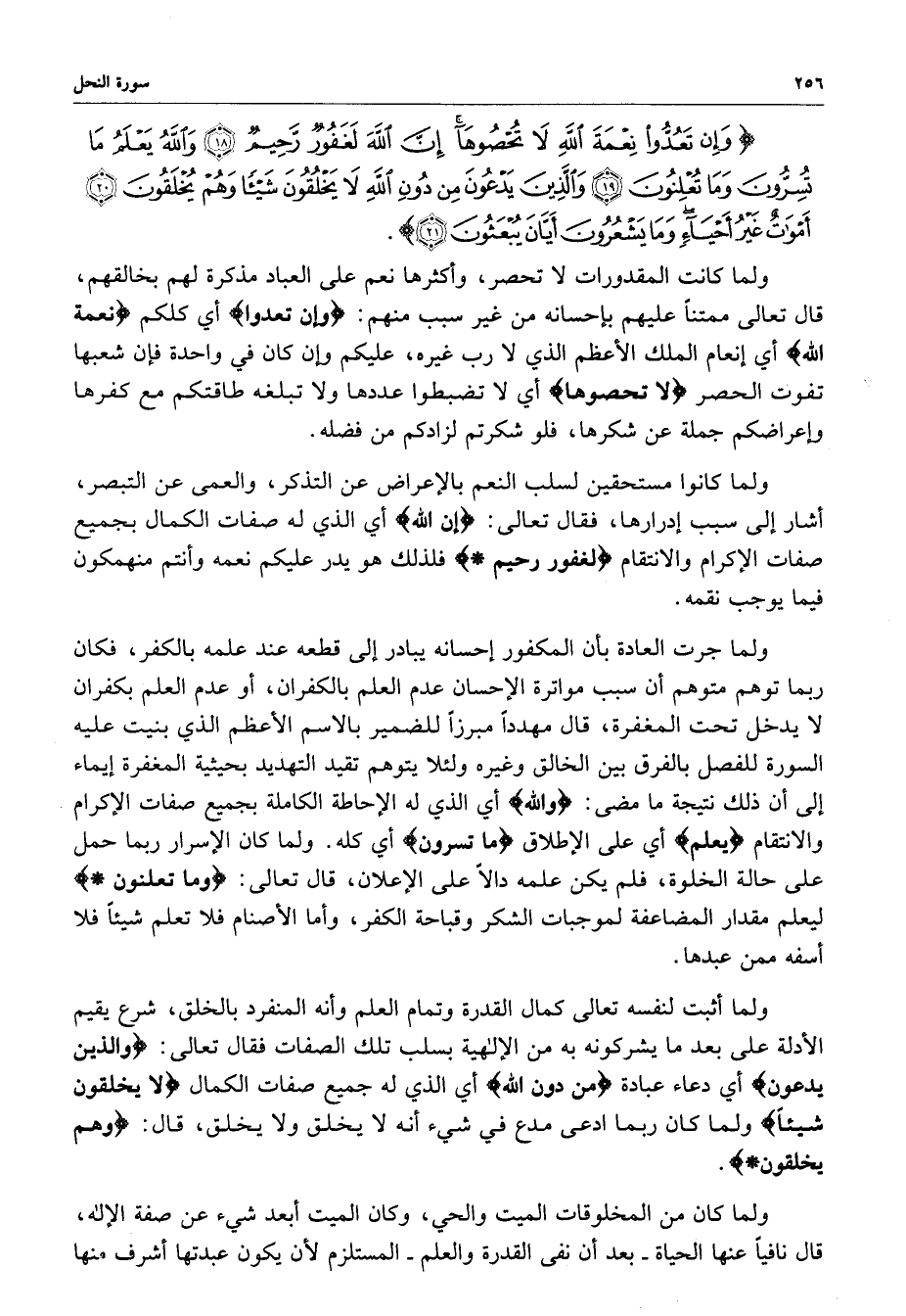 ) وَإِن تَعُدُّواْ نِعْمَةَ اللَّهِ لاَ تُحْصُوهَآ إِنَّ اللَّهَ لَغَفُورٌ رَّحِيمٌ وَاللَّهُ يَعْلَمُ مَا تُسِرُّونَ وَمَا تُعْلِنُونَ وَالَّذِينَ يَدْعُونَ مِن دُونِ اللَّهِ لاَ يَخْلُقُونَ شَيْئاً وَهُمْ يُخْلَقُونَ أَمْواتٌ غَيْرُ أَحْيَآءٍ وَمَا يَشْعُرُونَ أَيَّانَ يُبْعَثُونَ ( ( )