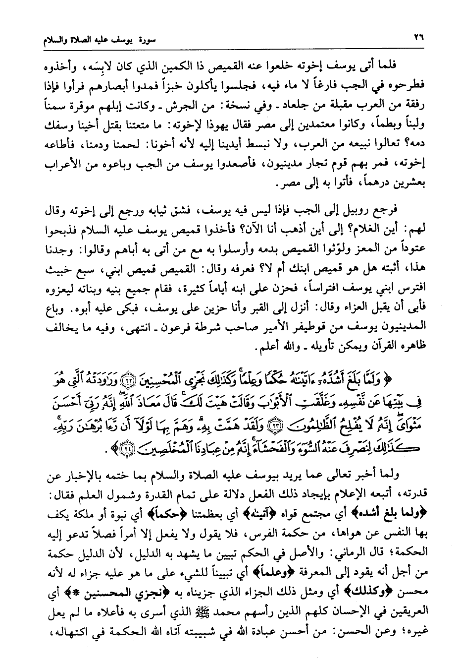 ) وَلَمَّا بَلَغَ أَشُدَّهُ آتَيْنَاهُ حُكْماً وَعِلْماً وَكَذلِكَ نَجْزِي الْمُحْسِنِينَ وَرَاوَدَتْهُ الَّتِي هُوَ فِي بَيْتِهَا عَن نَّفْسِهِ وَغَلَّقَتِ الأَبْوَابَ وَقَالَتْ هَيْتَ لَكَ قَالَ مَعَاذَ اللَّهِ إِنَّهُ رَبِّي أَحْسَنَ مَثْوَايَ إِنَّهُ لاَ يُفْلِحُ الظَّالِمُونَ وَلَقَدْ هَمَّتْ بِهِ وَهَمَّ بِهَا لَوْلا أَن رَّأَى بُرْهَانَ رَبِّهِ كَذَلِكَ لِنَصْرِفَ عَنْهُ السُّوءَ وَالْفَحْشَآءَ إِنَّهُ مِنْ عِبَادِنَا الْمُخْلَصِينَ ( ( )