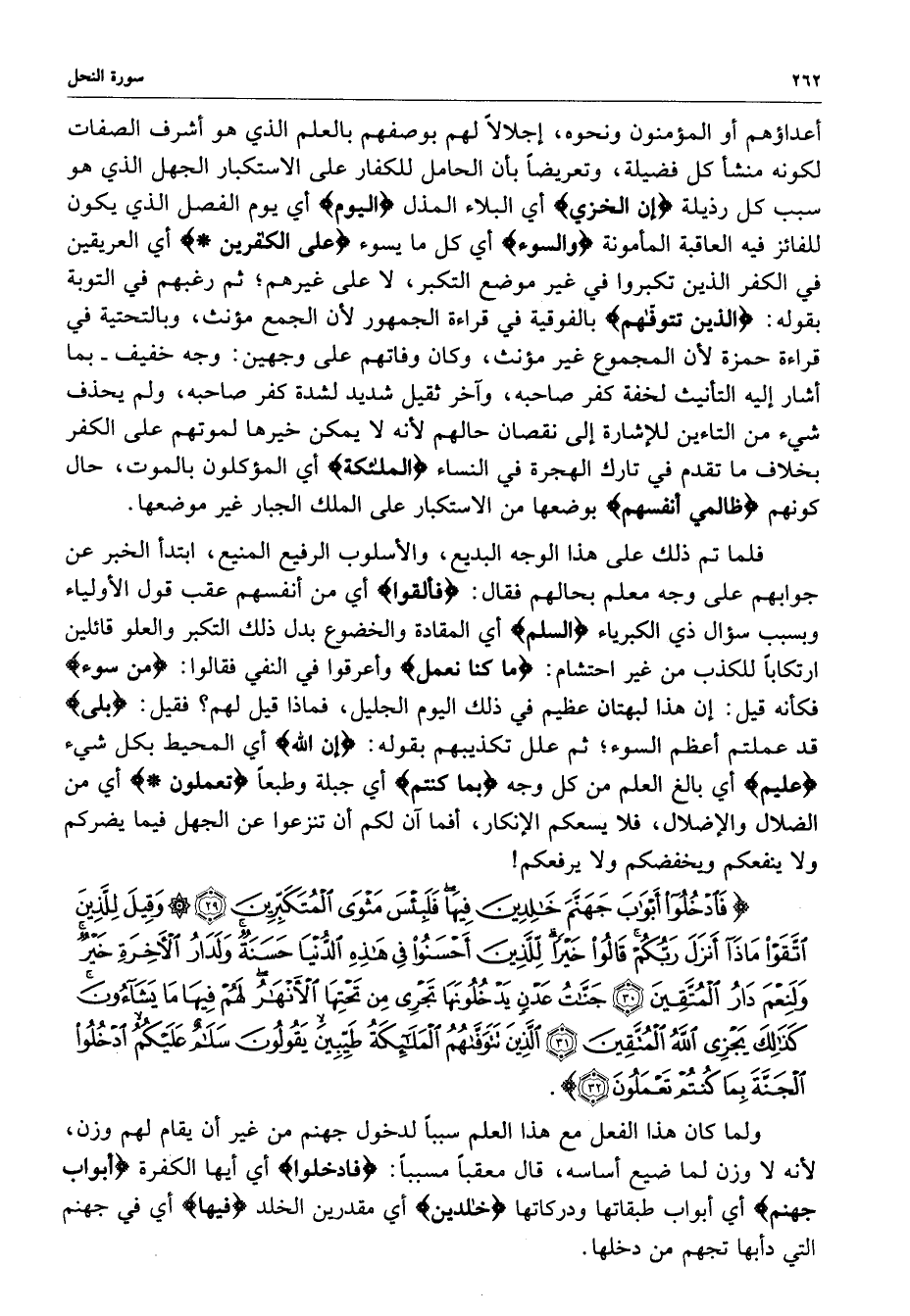 ) فَادْخُلُواْ أَبْوَابَ جَهَنَّمَ خَالِدِينَ فِيهَا فَلَبِئْسَ مَثْوَى الْمُتَكَبِّرِينَ وَقِيلَ لِلَّذِينَ اتَّقَوْاْ مَاذَا أَنْزَلَ رَبُّكُمْ قَالُواْ خَيْراً لِّلَّذِينَ أَحْسَنُواْ فِي هذِهِ الْدُّنْيَا حَسَنَةٌ وَلَدَارُ الآخِرَةِ خَيْرٌ وَلَنِعْمَ دَارُ الْمُتَّقِينَ جَنَّاتُ عَدْنٍ يَدْخُلُونَهَا تَجْرِي مِن تَحْتِهَا الأَنْهَارُ لَهُمْ فِيهَا مَا يَشَآؤونَ كَذَلِكَ يَجْزِي اللَّهُ الْمُتَّقِينَ الَّذِينَ تَتَوَفَّاهُمُ الْمَلائِكَةُ طَيِّبِينَ يَقُولُونَ سَلامٌ عَلَيْكُمُ ادْخُلُواْ الْجَنَّةَ بِمَا كُنْتُمْ تَعْمَلُونَ ( ( )