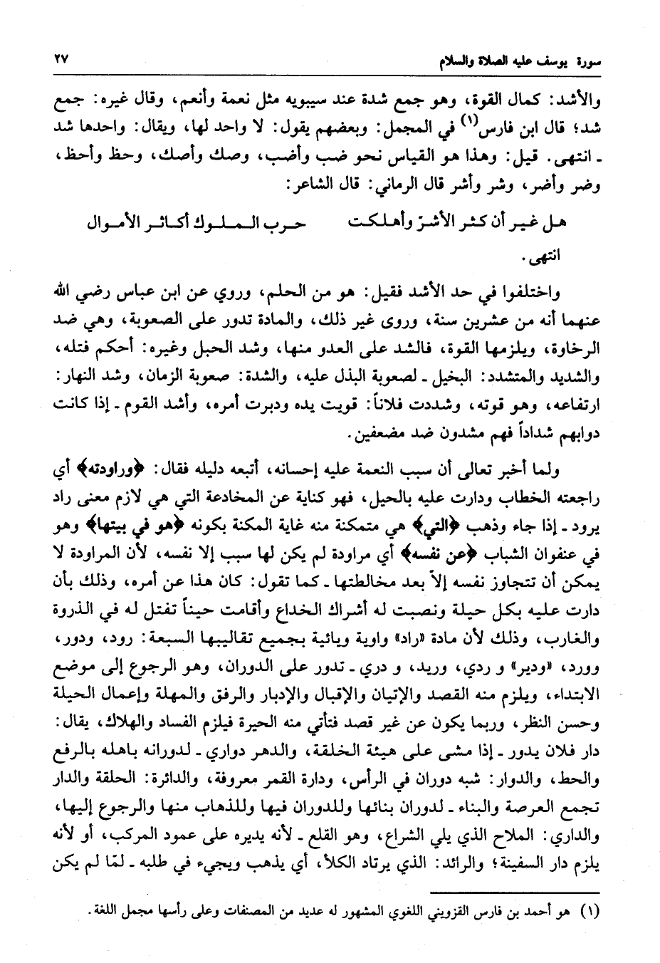ولما أخبر تعالى أن سبب النعمة عليه إحسانه ، أتبعه دليله فقال : ( وراودته ) أي راجعته الخطاب ودارت عليه بالحيل ، فهو كناية عن المخادعة التي هي لازم معنى راد يرود - إذا جاء وذهب ) التي ( هي متمكنة منه غاية المكنة بكونه ) هو في بيتها ( وهو في عنفوان الشباب ) عن نفسه ) أي مراودة لم تكن لها سبب إلا نفسه ، لأن المراودة لا يمكن أن تتجاورز نفسه إلاّ بعد مخالطتها - كما تقول : كان هذا عن أمره ، وذلك بأن دارت عليه بكل حيلة ونصبت له أشراك الخداع وأقامت حيناً تفتل له في الذروة والغارب ، وذلك لأن مادة ( راد ) واوية ويائية بجميع تقاليبها السبعة : رود ، ودور ، وورد ، ( ودير ) وردي ، وريد ، ودري - تدور على الدوران ، وهو الرجوع إلى موضع الابتداء ، ويلزم منه القصد والإتيان والإقبال والإدبار والرفق والمهلة وإعمال الحيلة وحسن النظر ، وربما يكون عن غير قصد فتأتي منه الحيرة فيلزم الفساد والهلاك ، يقال : دار فلان يدور - إذا مشى على هيئة الخلقة ، والدهر دواري - لدورانه باهله بالرفع والحط ، والدوار : شبه دوران في الرأس ، ودارة القمر معروفة ، والدائرة : الحلقة والدار تجمع العرصة والبناء - لدوران بنائها وللدوران فيها وللذهاب منها والرجوع إليها ، والداري : الملاح الذي يلي الشرع ، وهو القلع - لأنه يديره على عمود المركب ، أو لأنه يلزم دار السفينة ؛ والرائد : الذي يرتاد الكلأ ، أي يذهب ويجيء في طلبه - لمّا لم يكن