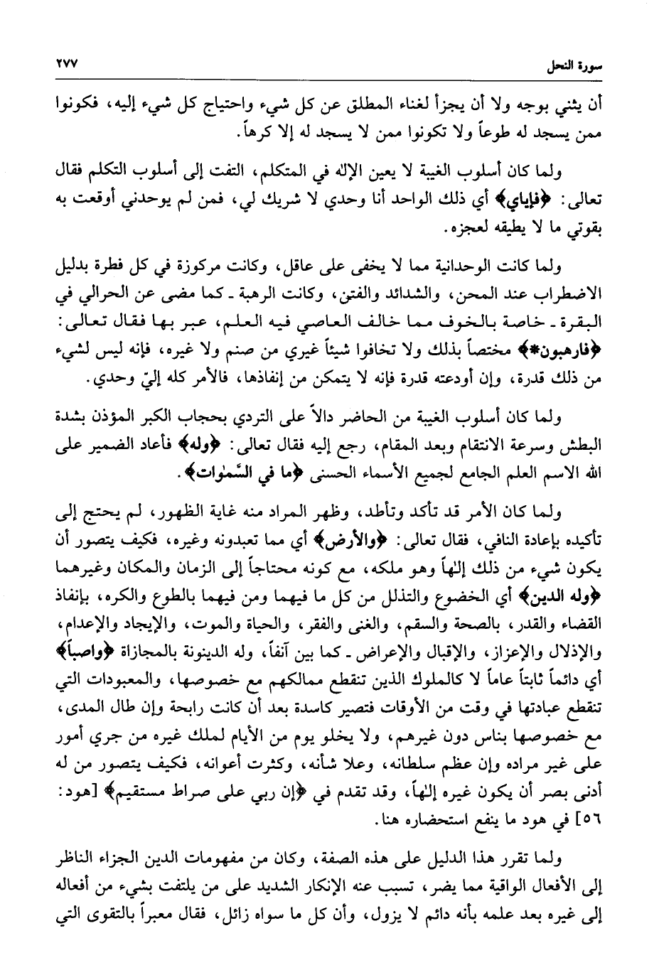 ولما كان الأمر قد تأكد وتأطد ، وظهر المراد منه غاية الظهور ، لم يحتج إلى تأكيده بإعاداة النافي ، فقال تعالى : ( والأرض ) أي مما تعبدونه وغيره ، فكيف يتصور أن يكون شيء من ذلك إلهاً وهو ملكه ، مع كونه محتاجاً إلى الزمان والمكان وغيرهما ) وله الدين ) أي الخضوع والتذلل من كل ما فيهما ومن فيهما بالطوع والكره ، بإنفاذ القضاء والقدر ، بالصحة والسقم ، والغني والفقر ، والحياة والموت ، والإيجاد والإعدام ، والإذلال والإعزاز ، والإقبال والإعراض - كما بين آنفاً ، وله الدينونة بالمجازاة ) واصباً ) أي دائماً ثابتاً عاماً لا كالملوك الذين تنقطع ممالكهم مع خصوصها ، والمعبودات التي تنقطع عبادتها في وقت من الأوقات فتصير كاسدة بعد أن كانت رابحة وإن طال المدى ، مع خصوصها بناس دون غيرهم ، ولا يخلو يوم من الأيام لملك غيره من جري أمور على غير مراده وإن عظم سلطانه ، وعلا شأنه ، وكثرت أعوانه ، فكيف يتصور من له أدنى بصر أن يكون غيره إلهاً ، وقد تقدم في