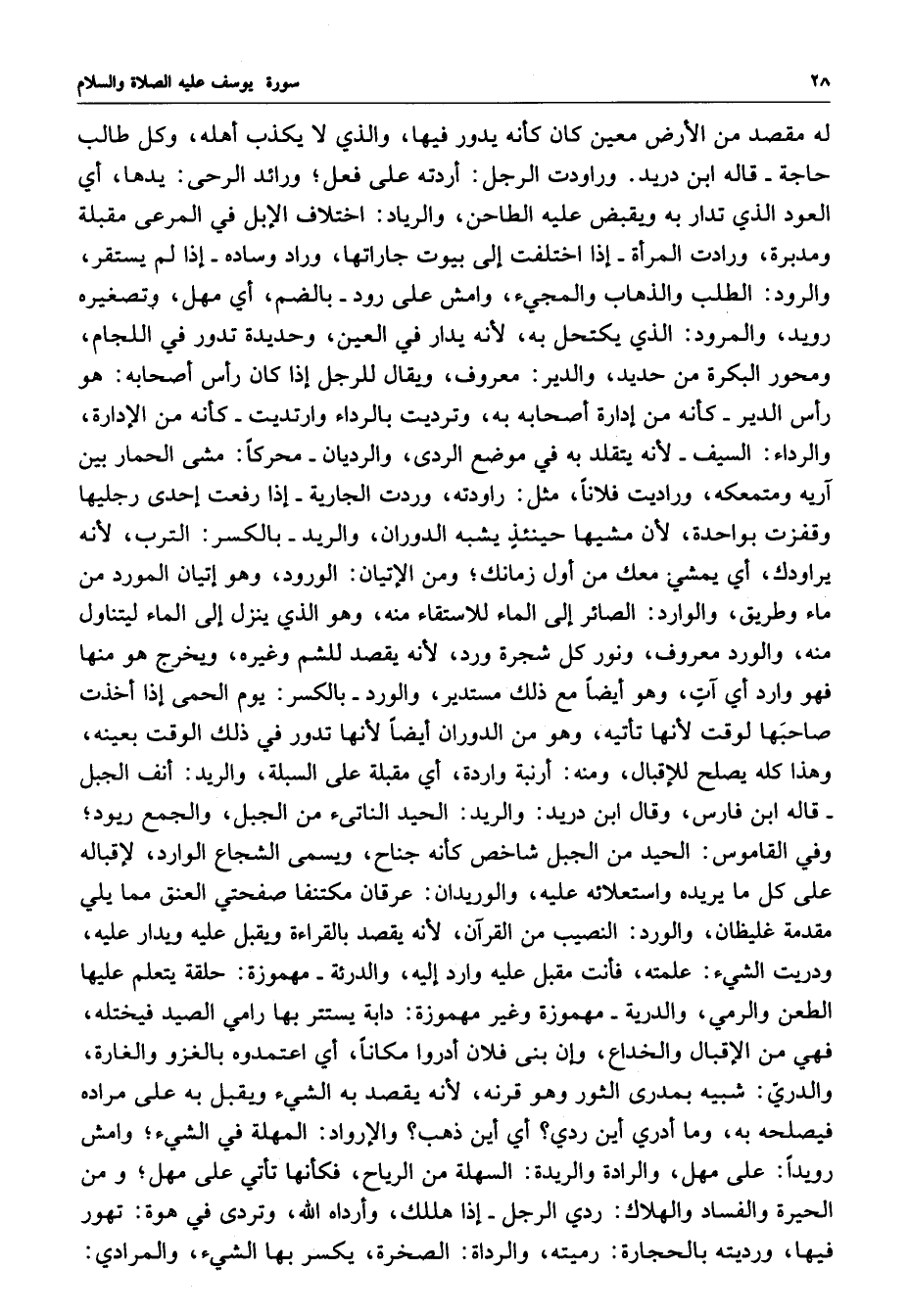 وراودت الرجل : أردته على فعل ؛ ورائد الرحى : يدها ، أي العود الذي تدار به ويقبض عليه الطاحن ، والرياد : اختلاف الإبل في المرعى مقبلة ومدبرة ، ورادت المرأة - إذا اختلفت إلى بيوت جاراتها ، وراد وساده - إذا لم يستقر ، والرود : الطلب والذهاب والمجيء ، وامش على رود - بالضم ، أي مهل ، وتصغيره رويد ، والمرود : الذي يكتحل به ، لأنه يدار في العين ، وحديدة تدور في اللجام ، ومحور البكرة من حديد ، والدير : معروف ، ويقال لرجل إذا كان رأس أصحابه : هو رأس الدير - كأنه من إرادة أصحابه به ، وترديت الرداء وارتديت - كأنه من الإدارة ، والرداء : السيف - لأنه يتقلد به في موضع الردى ، والرديان - محركاً : مشى الحمار بين آريه ومتمعكه ، وراديت فلاناً ، مثل : راودته ، وردت الجارية - إذا رفعت إحدى رجليها وقفزت بواحدة ، لأت مشيها حينئذٍ يشبه الدوران ، والريد - بالكسر : الترب ، لأنه يراودك ، أي يمشي معك من أول زمانك ؛ ومن الإتيان : الورود ، وهو إتيان المورد من ماء وطريق ، والوارد : الضائر إلى الماء للاستقاء منه ، وهو الذي ينزل إلى الماء ليتناول منه ، والورد معروف ، ونور كل شجرة ورد ، لأنه يقصد للشم وغيره ، ويخرج هو منها فهو وارد أي آتٍ ، وهو أيضاً مع ذلك مستدير ، والورد - بالكسر : يوم الحمى إذا أخذت صاحبَها لوقت لأنها تأتيه ، وهو أرنبة واردة ، أي مقبلة على السبلة ، والريد : أنف الجبل - قاله ابن فارس ، وقال ابن دريد : والريد : الحيد الناتىء من الجبل ، والجمع ريود ؛ وفي القاموس : الحيد من الجيل شاخص كأنه جناح ، ويسمى الشجاع الوارد ، لإقباله على كل كا يريده واستعلائه عليه ، والوريدان : عرقان مكتنفا صفحتي العنق مما يلي مقدمة غليظان ، والورد : النصيب من القرآن ، لأنه يقصد بالقراءة ويقبل عليه ويدار عليه ، ودريت الشيء : علمته ، فأنت مقبل عليه وارد إليه ، والدرئة - وهموزة : حلقة يتعلم عليها الطعن والرمي ، والدرية - مهموزة وغير مهموزة : دابة يستتر بها رامي الصيد فيختله ، فهي من الإقبال والخداع ، وإن بنى فلان أدواراً مكاناً ، أي اعتمدوا بالغزو والغارة ، والدريّ : شبيه بمدرى الثور وهو قرنه ، لأنه يقصد به الشيء ويقبل به على مراده فيصلحه به ، وما أدري أين ردي ؟ أي أين ذهب ؟ والإرواد : المهلة في الشيء ؛ وامش رويداً : على مهل ، والرادة والريدة : السهلة من الرياح ، فكأنها تأتي على مهل ؛ ومن الحيرة والفساد والهلاك : ردي الرجل - غذا هللك ، وأراده الله ، وتردى في هوة : تهور فيها ، ورديته بالحجارة : رميته ، والرداة : الصخرة ، يكسر بها الشيء ، والمرادي :