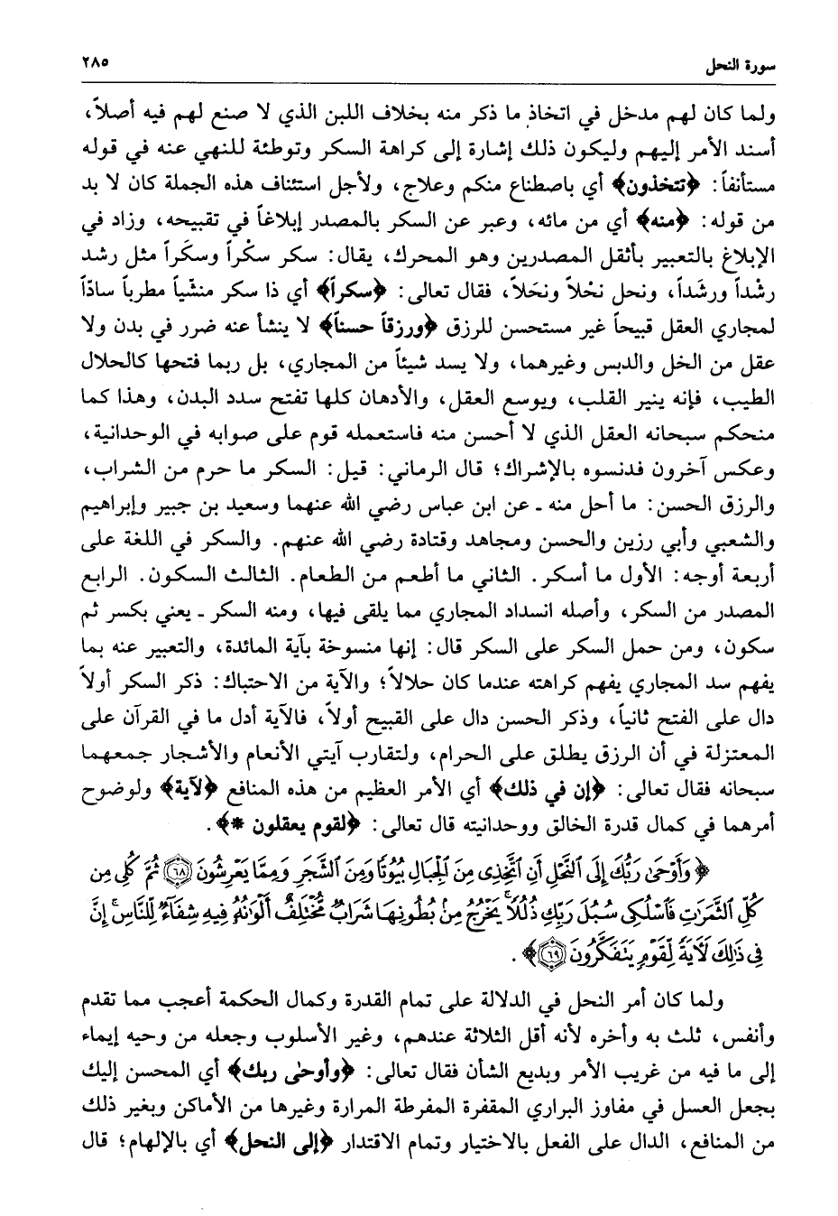 الرابع المصدر من السكر ، وأصله انسداد المجاري مما يلقي فيها ، ومنه السكر - يعني بكسر ثم سكون ، ومن حمل السكر على السكر قال : إنها منسوخة بآية المائدة ، والتعبير عنه بما يفهم سد المجاري يفهم كراهته عندما كان حلالاً ؛ والآية من الاحتباك : ذكر السكر أولاً دال على الفتح ثانياً ، وذكر الحسن دال القبيح أولاً ، فالآية أدل ما في القرآن على المعتزلة في أن الرزق يطلق على الحرام ، ولتقارب آيتي الأنعام والأشجار جمعهما سبحانه فقال تعالى : ( إن في ذلك ) أي الأمرالعظيم من هذه المنافع ) لآية ( ولوضوح أمرهما في كمال قدرة الخالق ووحدانيته قال تعالى : ( لقوم يعقلون ( .