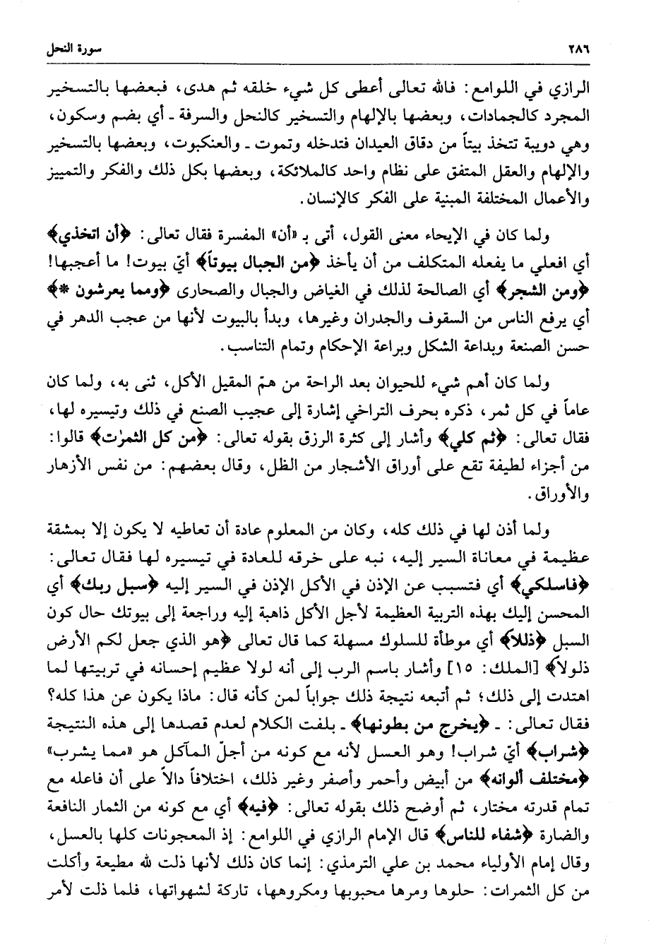 [ الملك : 15 ] وأشار باسم الرب إلى أنه لولا عظيم إحسانه في تربيتها لما اهتدت إلى ذلك ؛ ثم أتبعه نتيجة ذلك جواباً لمن كأنه قال : ماذا يكون عن هذا كله ؟ فقال تعالى : - ) يخرج من بطونها ( - بلفت الكلام لعدم قصدها إلى هذه النتيجة ) شراب ( أيّ شراب وهو العسل لأنه مع كونه من أجلّ المآكل هو ( مما يشرب ) ) مختلف ألوانه ( من أبيض وأحمر وأصفر وغير ذلك ، واختلافاً دالاً على أن فاعله مع تمام قدرته مختار ، ثم أوضح ذلك بقوله تعالى : ( فيه ) أي مع كونه من الثمار النافعة والضارة ) شقاء للناس ( قال الإمام الرازي في اللوامع : ذا المعجونات كلها بالعسل ، وقال إمام الأولياء محمد بن علي الترمذي : إنما كان ذلك لأنها ذلت لله مطيعة وأكلت من كل الثمرات : حلوها ومرها محبوبها ومكروهها ، تاركة لشهواتها ، فلما ذلت لأمر